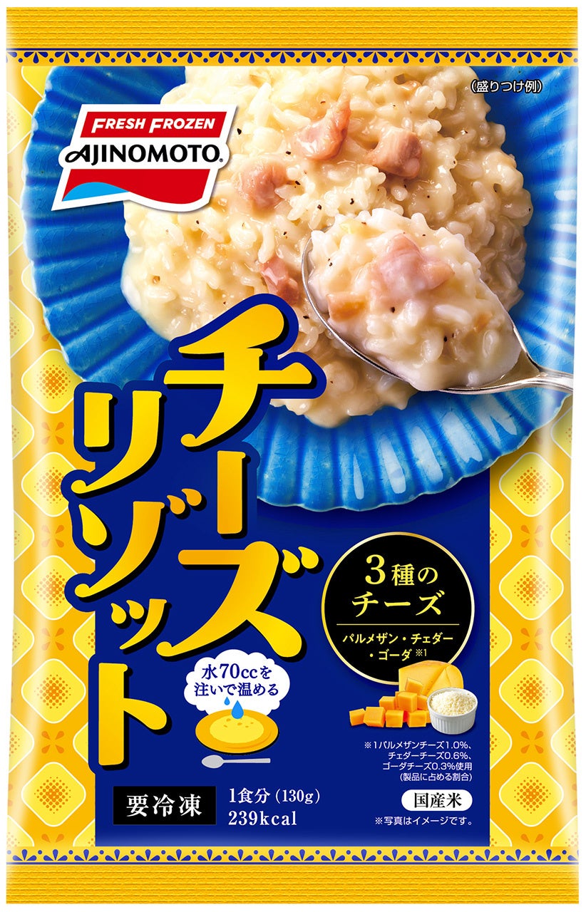 冷凍米飯市場は、2025年に入っても続く米不足の影響もあり、堅調に拡大しています。食の嗜好が多様化する一方で、既存の冷凍炒飯や冷凍ピラフのラインナップにはベーシックな味付けのものが多くなっており、家庭内個食での、自分好みの味のメニューや本格的な味わいのメニューを手軽に食べたいというニーズに対応しきれていませんでした。このような状況を受け、2025年2月に1食食べきりサイズの冷凍米飯<麻辣飯><パクチー飯>を新発売したところ、非常に好調に推移しています。そこで今回新たに、1食食べきりサイズ(130g/袋)の<チーズリゾット>を発売し、ラインナップを強化します。新発売の<チーズリゾット>は、凝縮されたうま味のパルメザン、奥行きのある酸味のチェダー、まろやかな甘みのゴーダの3種のチーズを使用した、濃厚でコク深いリゾットです。リゾットらしいかためのお米の食感を再現するために、水を入れてから電子レンジ調理する新たな方法を採用し、ランチの1食として満足していただける本格的な味わいに仕上げました。