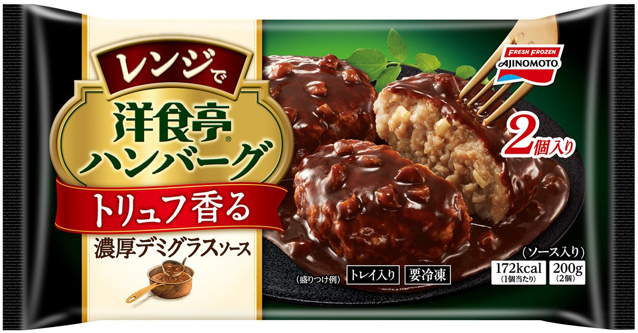 今回発売する「洋食亭®」<レンジでハンバーグ トリュフ香る濃厚デミグラスソース 2個入り>は、食べたい時にトレイのまま電子レンジで調理するだけで、簡単にできあがるハンバーグです。1997年の発売以来、本格的な味わいに定評のある「洋食亭®」ハンバーグと同じこだわりの製法でつくられています。ハンバーグは鉄板で直火焼きした後オーブンでじっくり火を入れ、ふっくらジューシーに焼き上げました。さらに、自家製デミグラスソースは直火釜で小麦粉からじっくり丁寧に炒めたブラウンルゥをベースに黒トリュフオイルを使用し、コク深く仕上げています。使い勝手のよいサイズと調理性で、冷凍ハンバーグの使用オケージョンをさらに拡大します。