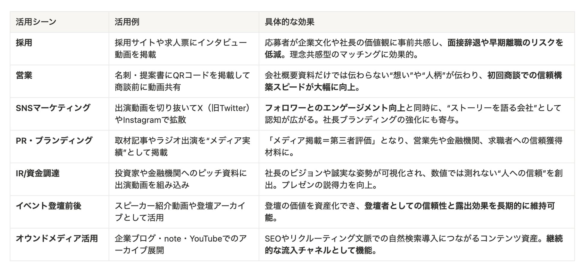本番組は、出演して終わりではありません。社長の“声”を中心にしたコンテンツは、以下のように多面的に活用可能です。