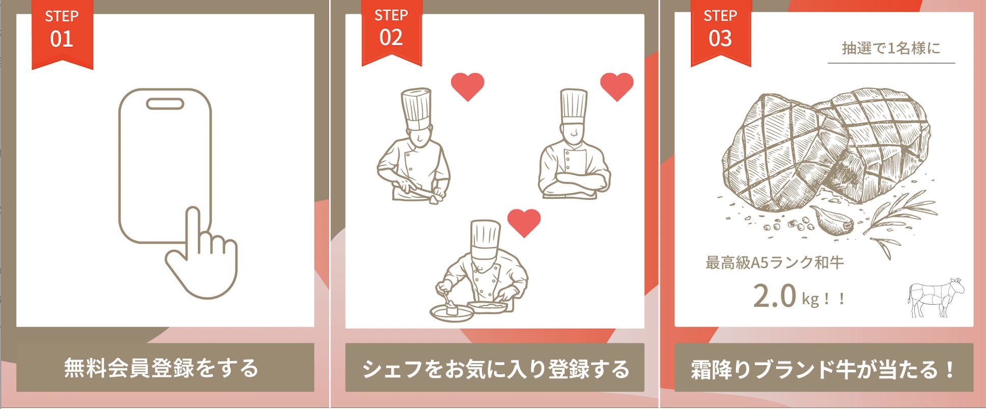 - 応募方法:期間中、無料会員登録をし、お気に入りシェフを1名以上登録した方の中からご当選者の方に、シェアダイン運営局よりご連絡します