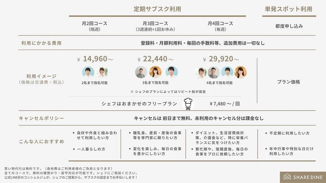 ご利用者様にもっとも支持されていた「ライフステージ、ライフスタイルに応じて、複数のシェフに来ていただく」ご利用方法をそのまま定期サービスにしました。