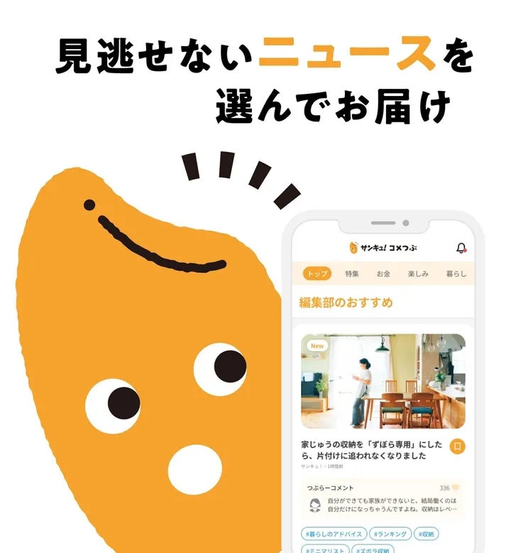 ベネッセが提供する「サンキュ!コメつぶ」は、生活情報誌『サンキュ!』がプロデュースした、暮らしに欠かせないニュースを選りすぐってお届けするニュースコミュニティアプリです。家計のやりくり、家と暮らし、健康・美容、教育、新商品情報、エンタメ、社会など幅広いジャンルから、知っておきたいニュースを集めて毎日お届けします。
