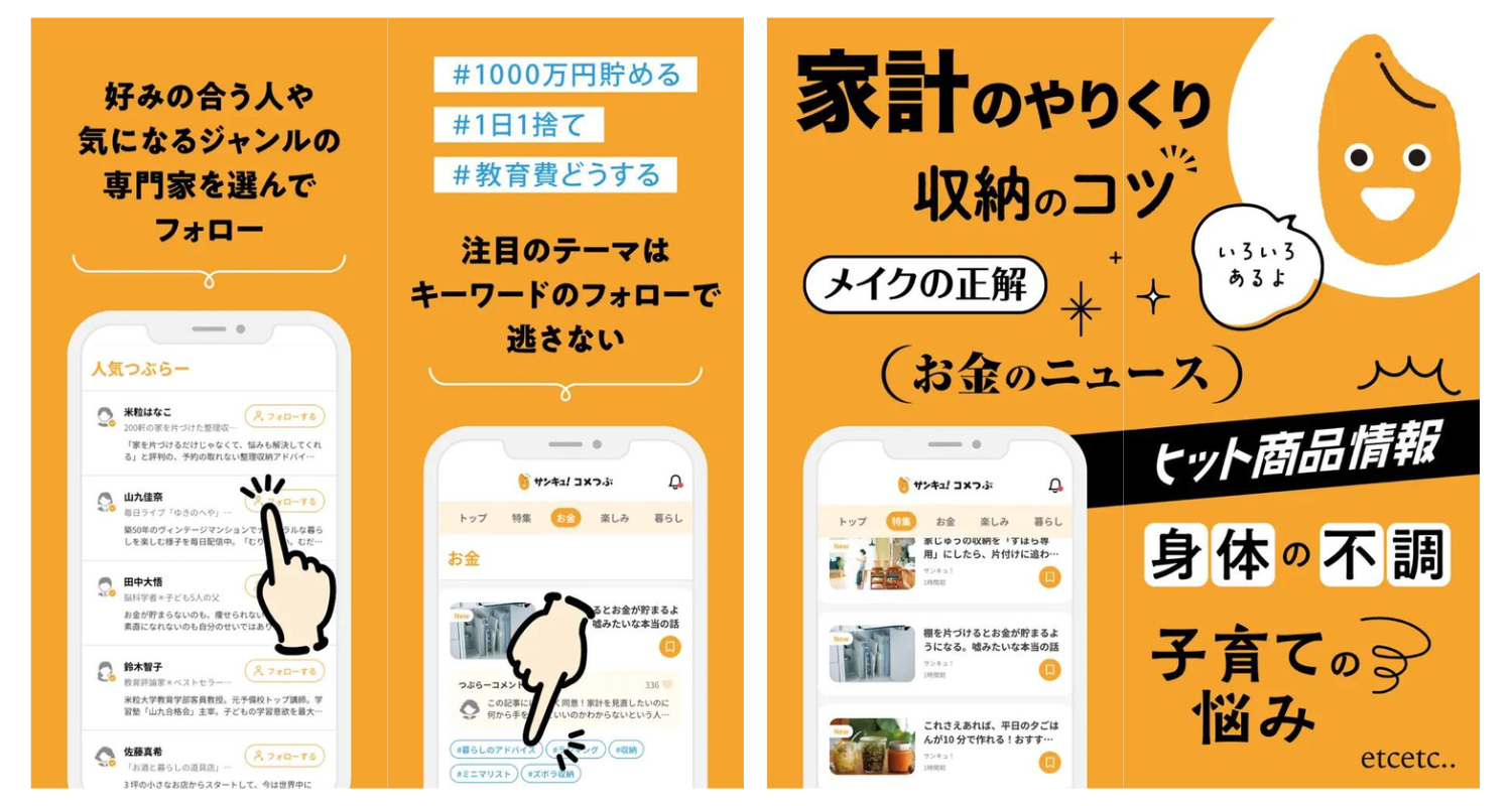コメントとつぶやきを集めるが名前の由来。 お金や家事をはじめ、仕事、ヘルスケア、子育て、趣味など暮 らしに関するニュースをわかりやすく紹介。