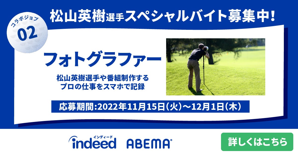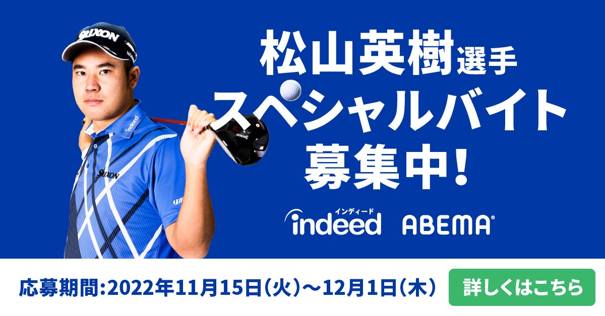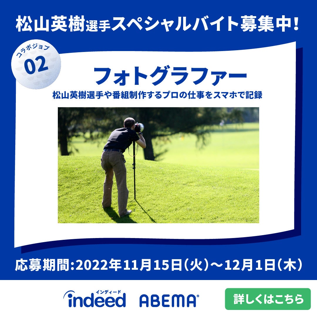 さらにIndeedは、ゴルフに関する仕事に携わってみたいと考えている方々と共に本番組を制作したいと考え、番組収録の際に松山選手を支える3つの特別な仕事を募集します。番組収録時に松山選手をサポートする「松山英樹選手の番組収録サポートスタッフ」、選手たちおよび番組制作に関わるスタッフを撮影する「フォトグラファー」、松山選手はじめ番組に出演するプロゴルファー達へ質問をする「リモートライター」をそれぞれ11月15日(火)から12月1日(木)までの期間、Indeed上および特設ページ(https://jp.indeed.com/cm/special/hideki-matsuyama)で募集いたします。Indeedは、「We help people get jobs.」をミッションとし、あらゆる人々が自分に合った仕事を見つけられるような社会の実現を目指しています。Indeedはこれからも、人々が仕事やキャリア形成に向けて多様な可能性を感じられる機会を創出して参ります。