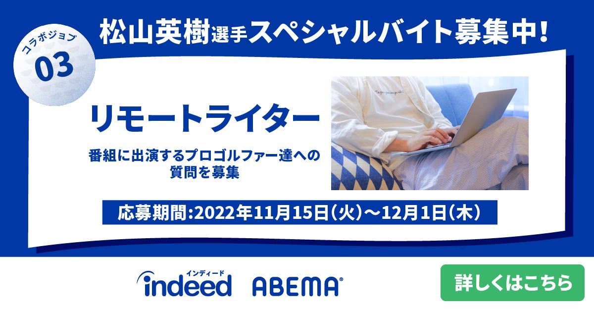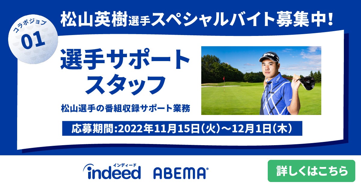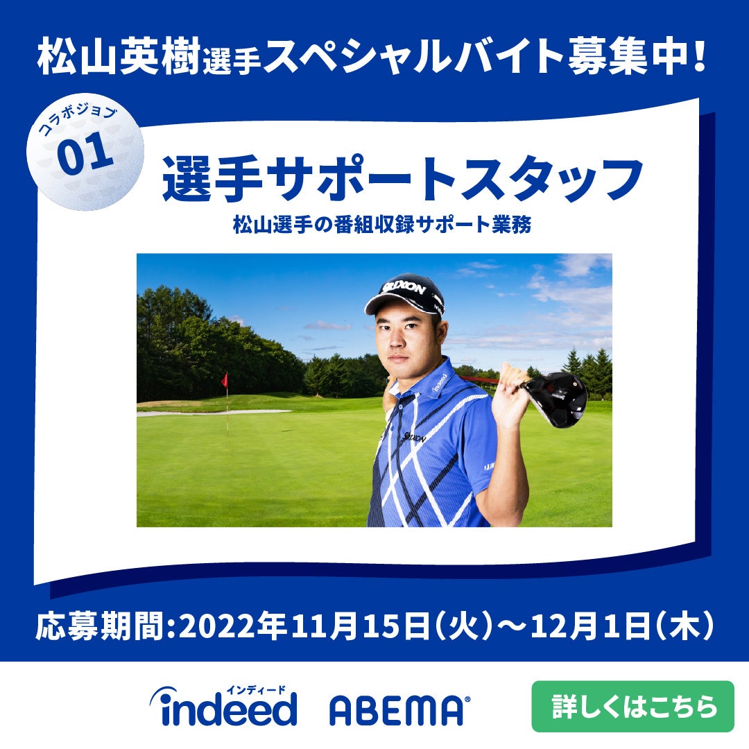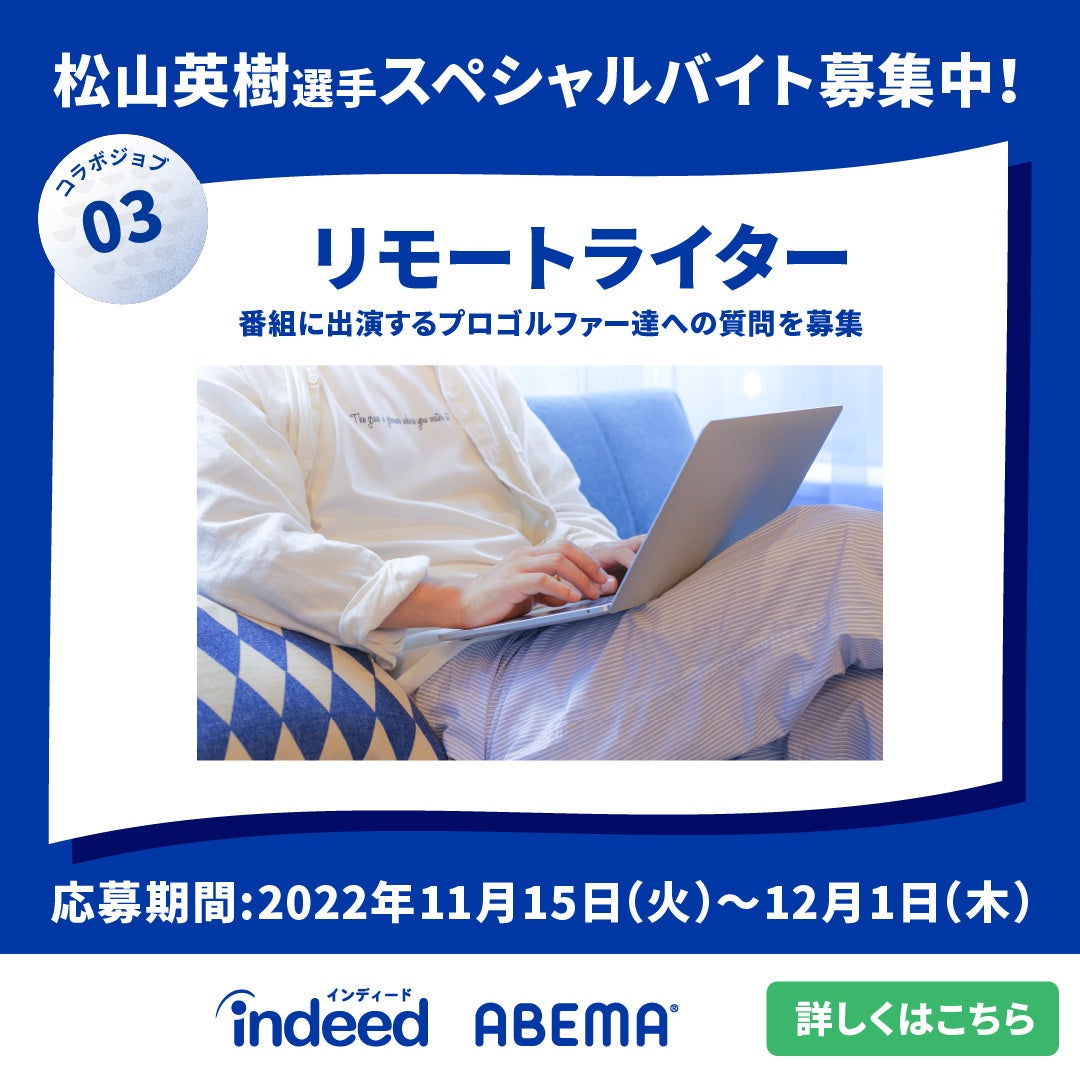 さらにIndeedは、ゴルフに関する仕事に携わってみたいと考えている方々と共に本番組を制作したいと考え、番組収録の際に松山選手を支える3つの特別な仕事を募集します。番組収録時に松山選手をサポートする「松山英樹選手の番組収録サポートスタッフ」、選手たちおよび番組制作に関わるスタッフを撮影する「フォトグラファー」、松山選手はじめ番組に出演するプロゴルファー達へ質問をする「リモートライター」をそれぞれ11月15日(火)から12月1日(木)までの期間、Indeed上および特設ページ(https://jp.indeed.com/cm/special/hideki-matsuyama)で募集いたします。Indeedは、「We help people get jobs.」をミッションとし、あらゆる人々が自分に合った仕事を見つけられるような社会の実現を目指しています。Indeedはこれからも、人々が仕事やキャリア形成に向けて多様な可能性を感じられる機会を創出して参ります。