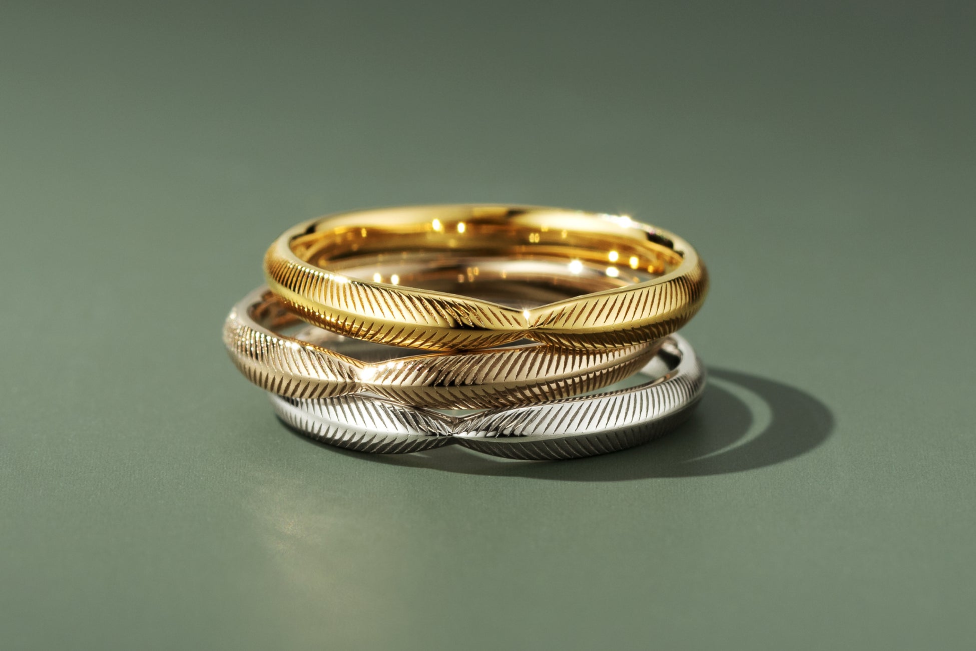 印象的なテクスチャーやフォルムで、唯一無二の存在感を目指した90種類以上のデザインに、お好みのリング幅・素材・ダイヤモンドの有無等を組み合わせ、細部までこだわりカスタマイズできるのが特徴。また、リングの内側は、デザインごとに最も心地よいバランスをコンマ単位で追求。日常に馴染むなめらかな着け心地を楽しんでいただけます。
