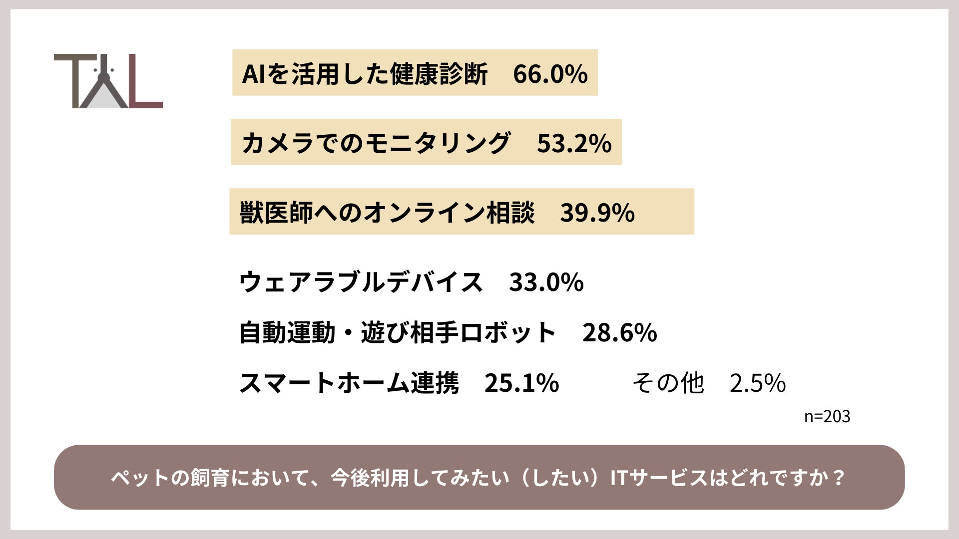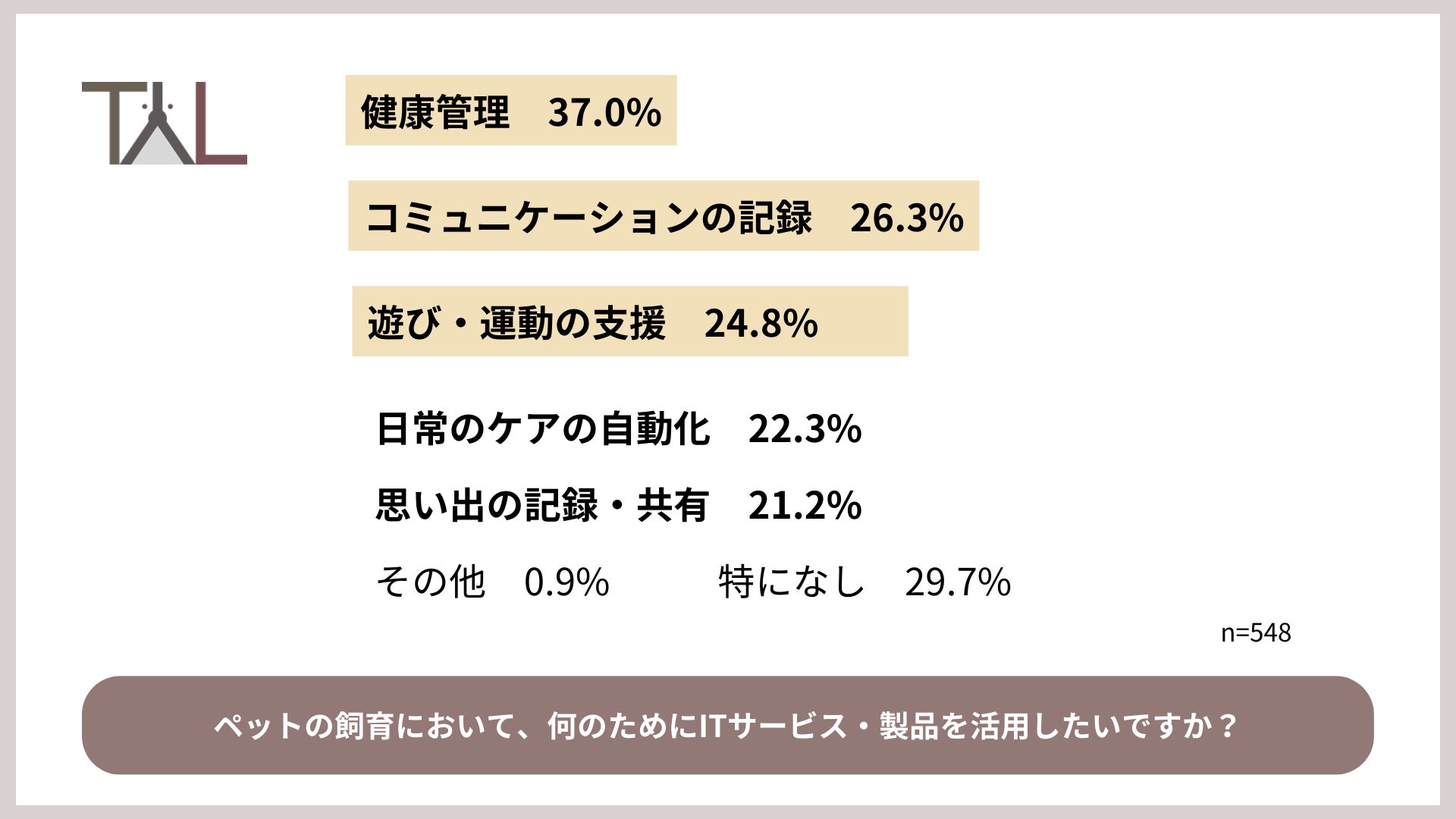 ペットの健康管理のためにITサービスを利用したい方が3割以上。コミュニケーションの記録や日常のケアなどさまざまな目的で需要が高まる。