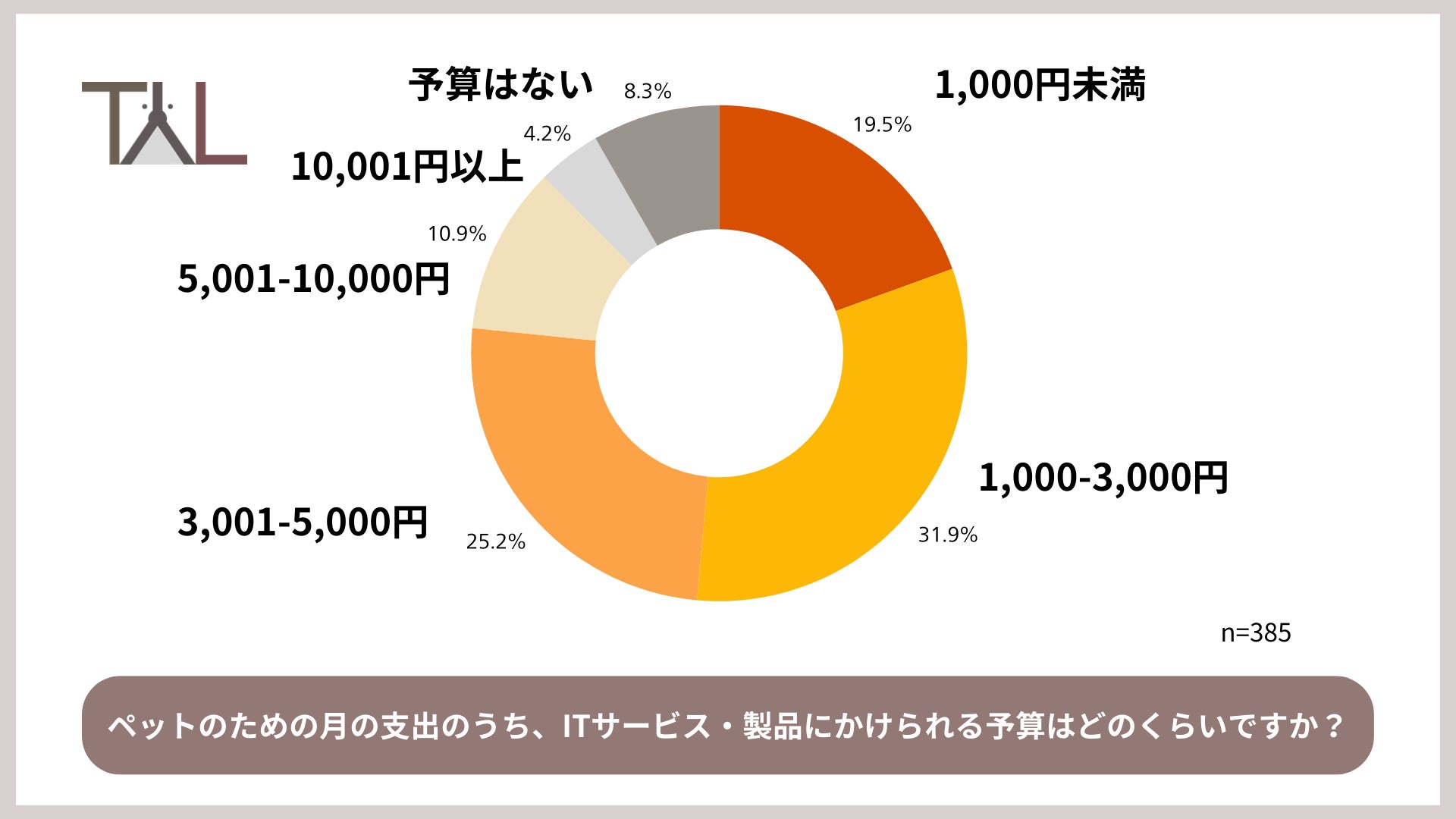 また、犬猫の飼い主385名に対し「ペットのための月の支出のうち、ITサービス・製品にかけられる予算はどのくらいですか?」と質問したところ、1位「1,000-3,000円」(31.9%)、2位「3,001-5,000円」(25.2%)、3位「1,000円未満」(19.5%)という結果となりました。