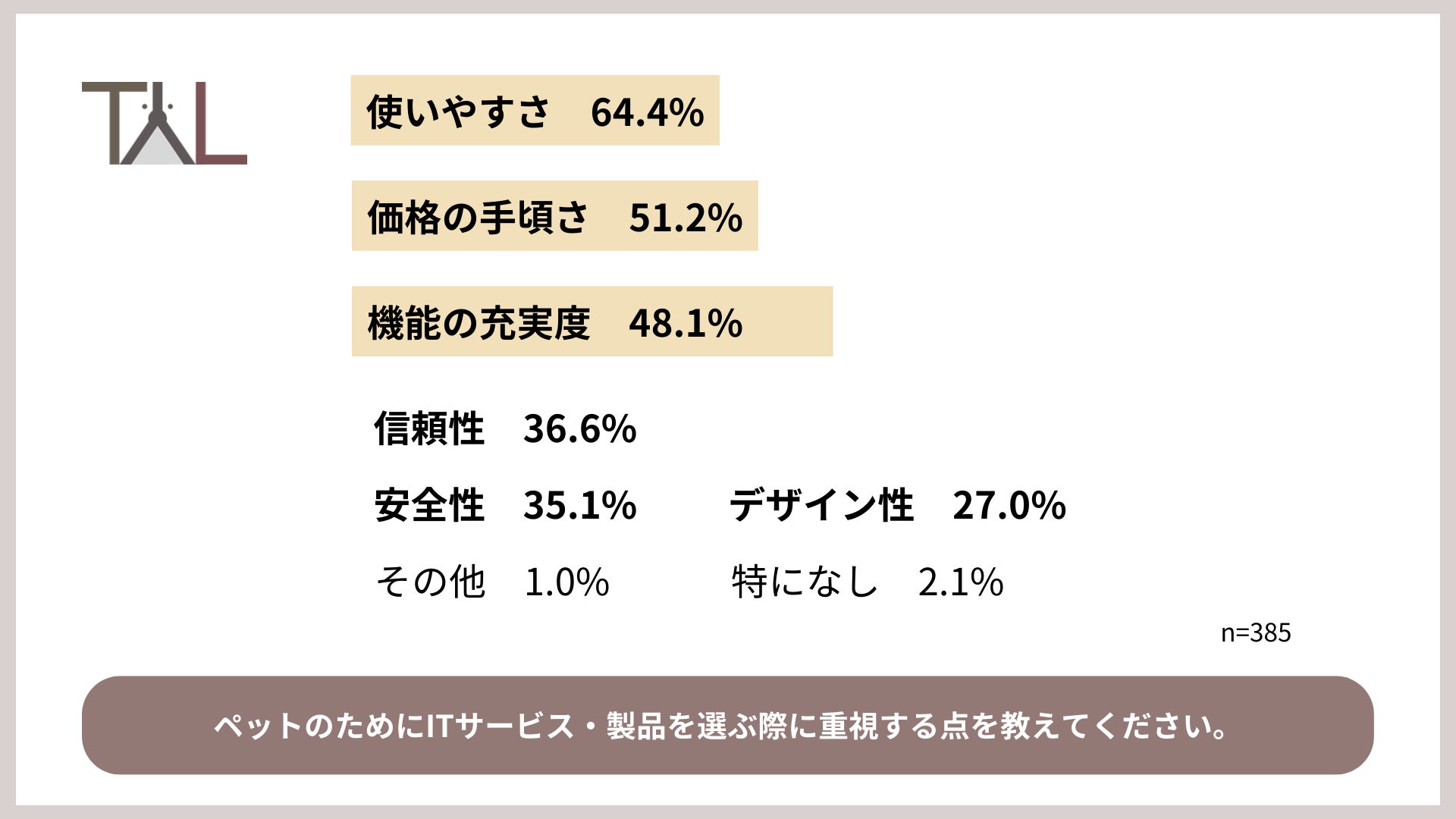 犬猫の飼い主385名に対し「 ペットのためにITサービス・製品を選ぶ際に重視する点を教えてください。」と質問したところ、「使いやすさ」(64.4%)、「価格の手頃さ」(51.2%)を求める回答が多く集まりました。そのほか、「機能の充実度」(48.1%)や、「信頼性」(36.6%)、「安全性」(35.1%)などを重視するという意見も。多くの観点から、サービスを検討したい飼い主の意向が見えました。