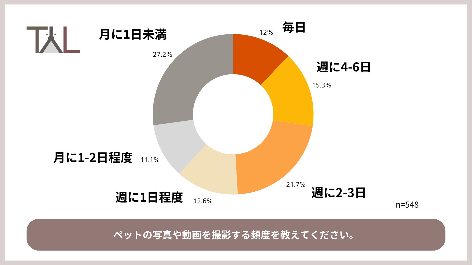 犬猫の飼い主548名に対し「ペットの写真や動画を撮影する頻度を教えてください。」と質問したところ、「週に2-3日」と回答した方が21.7%、次に多かったのが「週に4-6日」(15.3%)でした。「毎日」写真を撮る飼い主も1割以上(12.0%)で、これらを合わせると全体の半数近くの飼い主がペットの写真を2日に1回以上撮影しているという実態が見えてきました。
