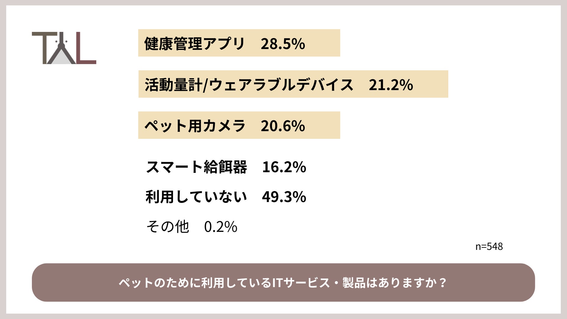 犬猫の飼い主548名に対し「ペットのために利用しているITサービス・製品はありますか?」と質問したところ、過半数を超える50.7%の飼い主が、何かしらのペット向けITサービスを利用していることが分かりました。普及率1位は「健康管理アプリ」(28.5%)、2位「活動量計/ウェアラブルデバイス」(21.2%)、3位「ペット用カメラ」(20.6%)という結果となりました。