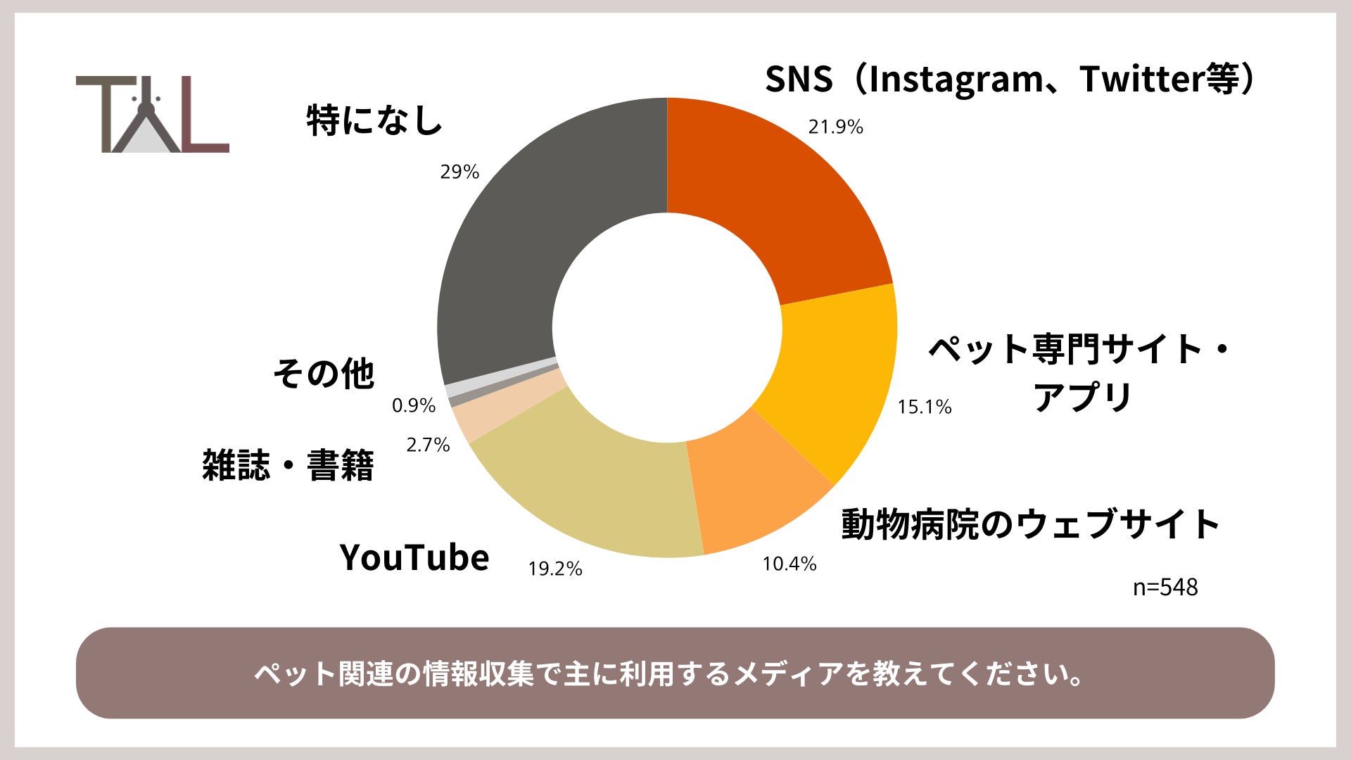 また、犬猫の飼い主548名に対し「ペット関連の情報収集で主に利用するメディアを教えてください。」と質問したところ、1位は「SNS(InstagramやXなど)」(21.9%)、2位「YouTube」(19.2%)、3位「ペット専門サイト・アプリ」(15.1%)という結果となり、多くの飼い主が、ペットに関する情報をSNSやWEBから取得していることが分かりました。