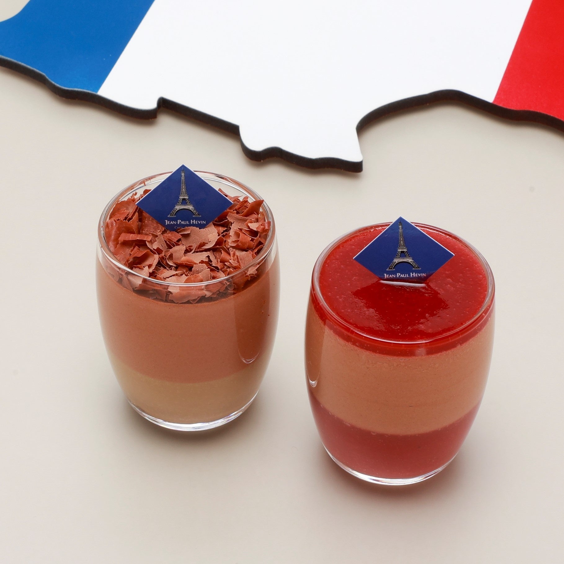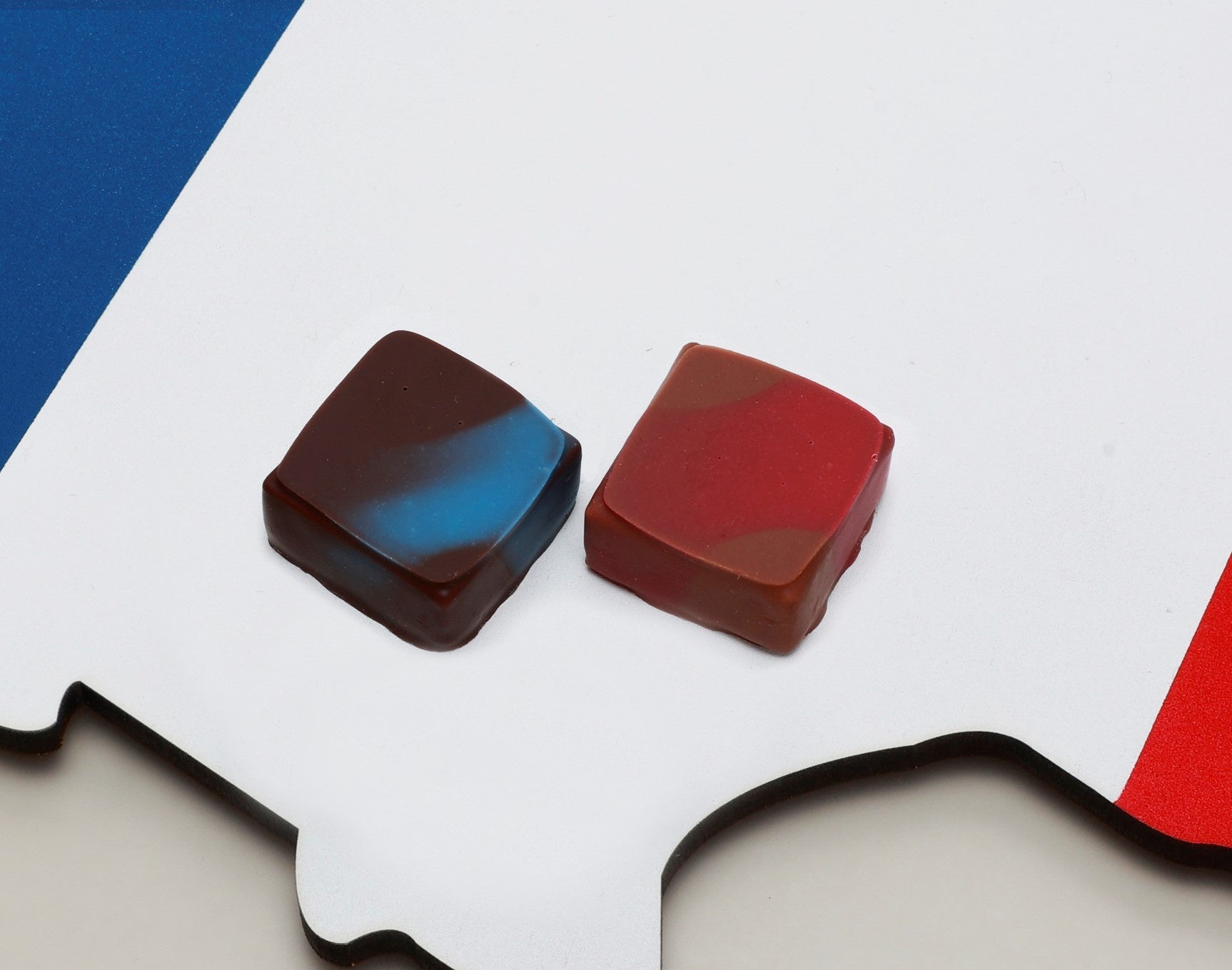 フランス国旗をイメージした期間限定ボンボンショコラ。イチゴとフランボワーズのキャラメルをミルクチョコレートでコーティング。