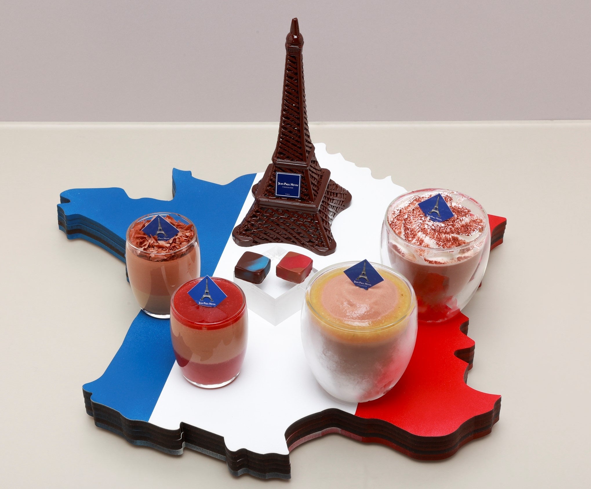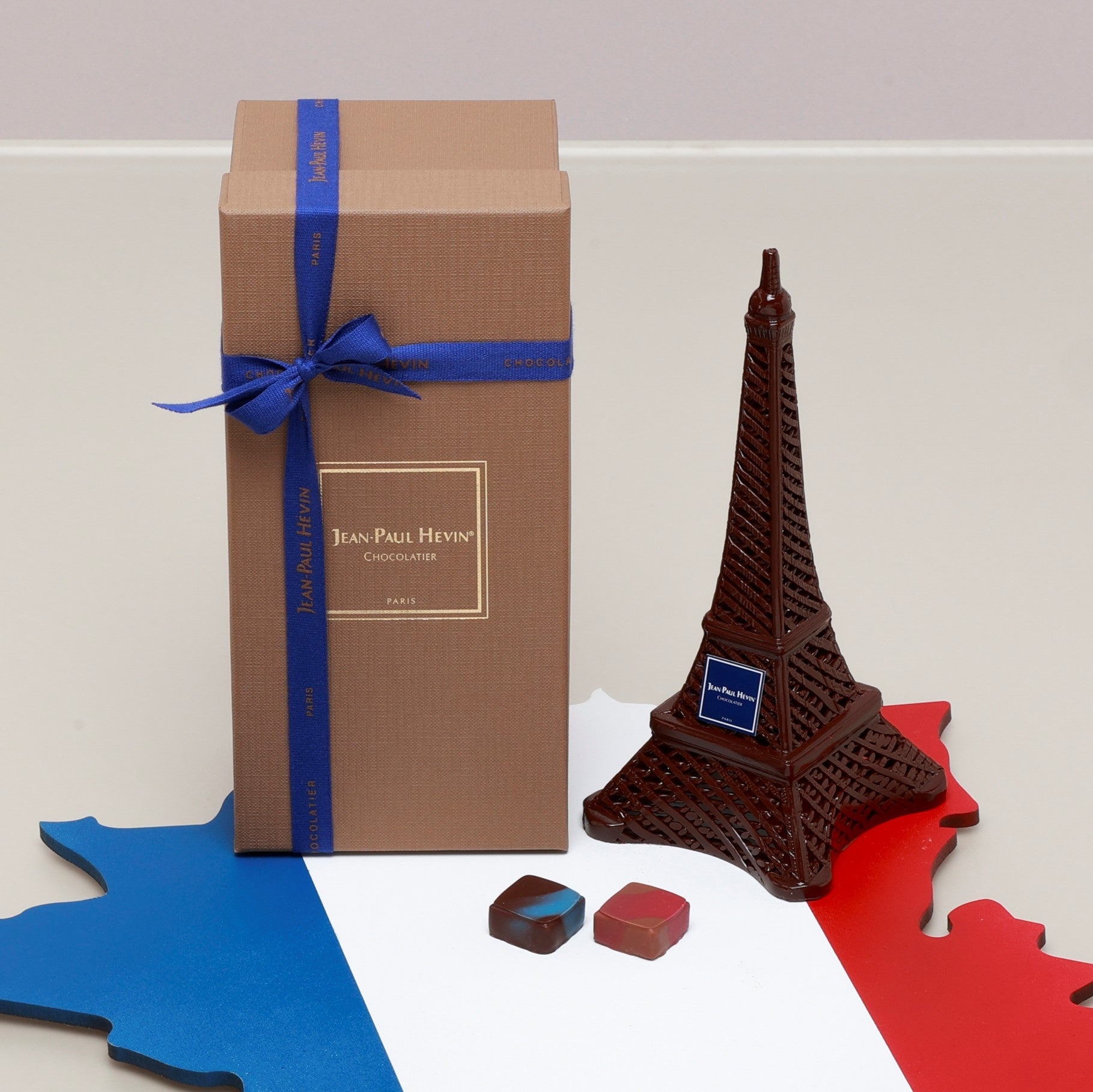 エッフェル塔をかたどったチョコレート細工とトリコロールカラーの限定ボンボンの詰合せ。
