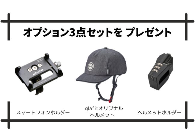 特定原付におけるヘルメットの着用は「努力義務」にとどまりますが、glafitでは安全面からヘルメットの着用を推奨しております。安全に乗り始めていただけるプレゼントセットになっております。