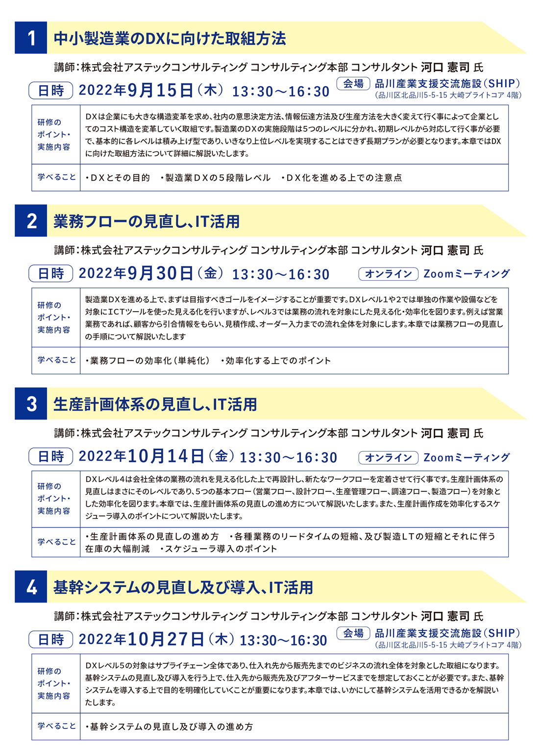 品川区ではそのような状況を鑑み、製造現場のデジタル化について推進可能な人材を育成する講座を開講します。