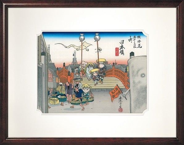 「妖怪道五十三次」の中から浮世絵木版画となったのは、東海道五十三次の日本橋、戸塚、平塚、小田原、丸子、御油、庄野、京師をモチーフとした8作品です。歌川広重の東海道五十三次からおよそ百七十年、現代まで脈々と受け継がれた古の技術とまったく同じ方法で制作されています。熟練の彫師、摺師の手により、水木しげるの描いた妖怪たちと日本の伝統工芸の融合をお楽しみください。