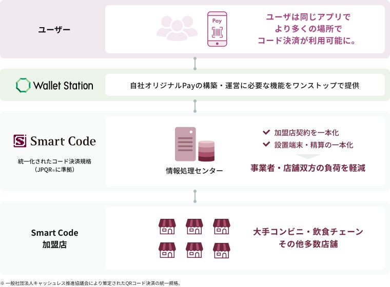 「Smart Code」対応により「Wallet Station」を活用したオリジナルPay導入企業は加盟店ごとに個別契約を結ぶことなく(※1)、オリジナルPayを全国の「Smart Code」加盟店に展開することができます。これにより全国の大手コンビニ、飲食チェーン、その他多数の店舗(※2)でオリジナルPayが利用可能になります。
