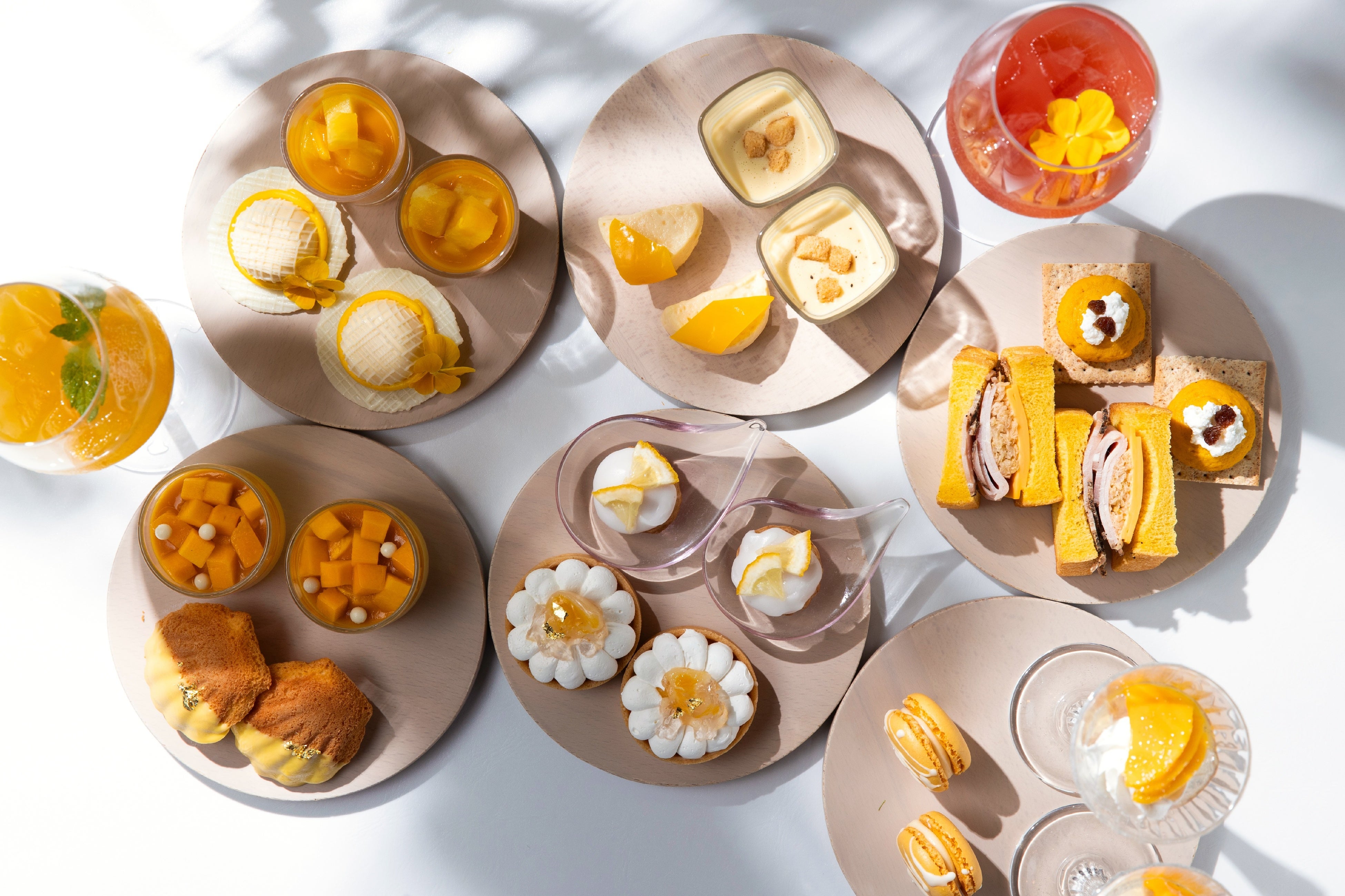 THE MOONのアフタヌーンティは、六本木ヒルズ森タワーのシルエットと店名「THE MOON (=月)」をイメージした高さ70cmを超える6段のスタンドで提供します。スタンドには、マンゴーの芳醇な甘みとミルクチョコレートのまろやかな味わいがマッチしたパフェや、フレッシュでジューシーな桃の香りが楽しめるタルト、麦わら帽子をモチーフにした夏らしい涼しげなはちみつ風味のムースをはじめとするパティシエこだわりのスイーツ8種と、ポークパストラミとシュークルート、チェダーチーズを挟んだチーズトースト、旬のコーンを使った冷製ポタージュなどのシェフ特製のセイボリー4種がラインナップした、夏限定のアフタヌーンティーです。