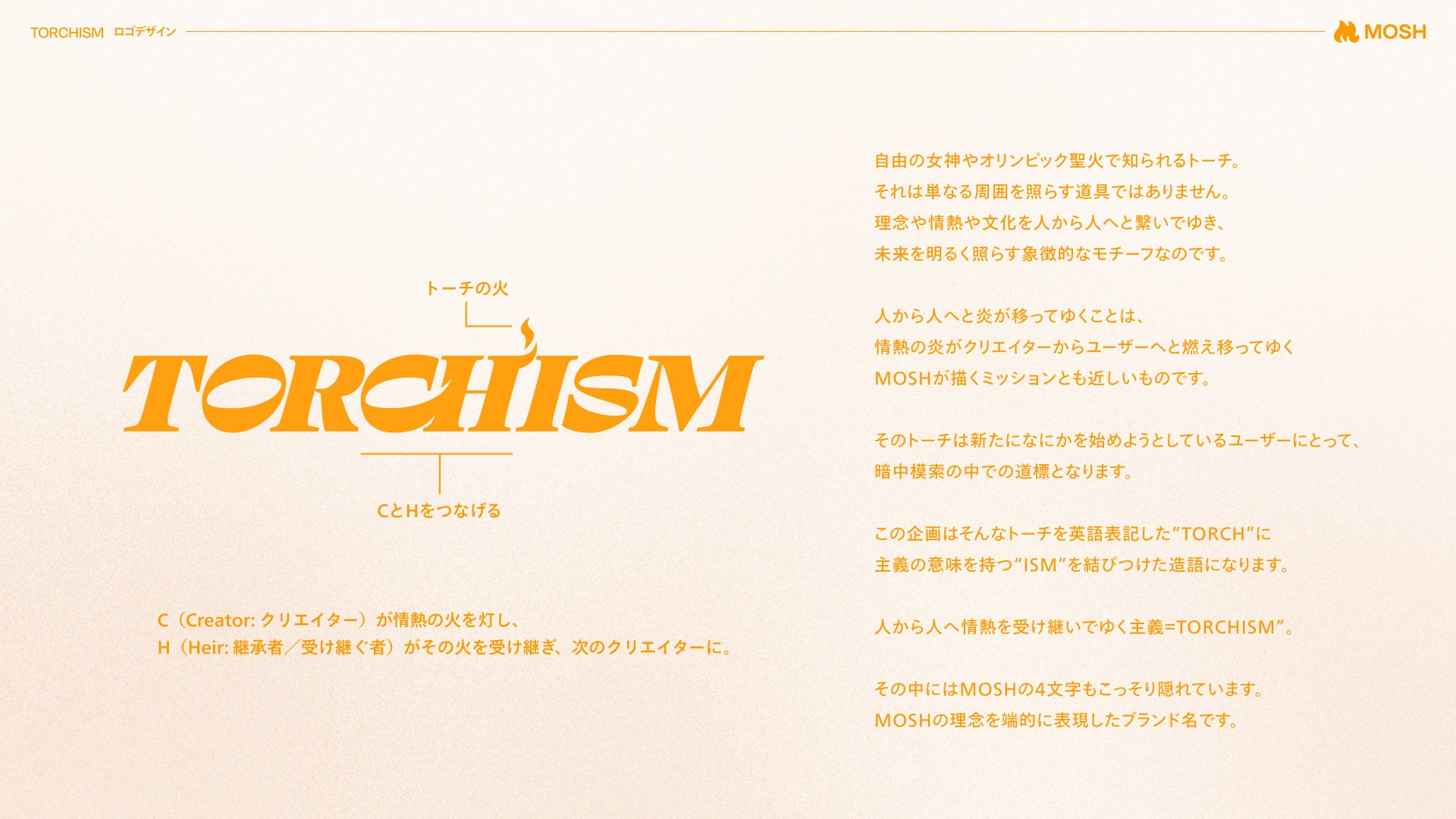 情熱に満ちた個人が活躍し、それを支持する人々が経済活動を循環させる時代が目前に来ています。MOSHはプラットフォームの提供のみならず、この「情熱のリレー」を促進するTORCHISMのような企画を通じ、新しい学び方・働き方・経済の在り方を提案していきます。