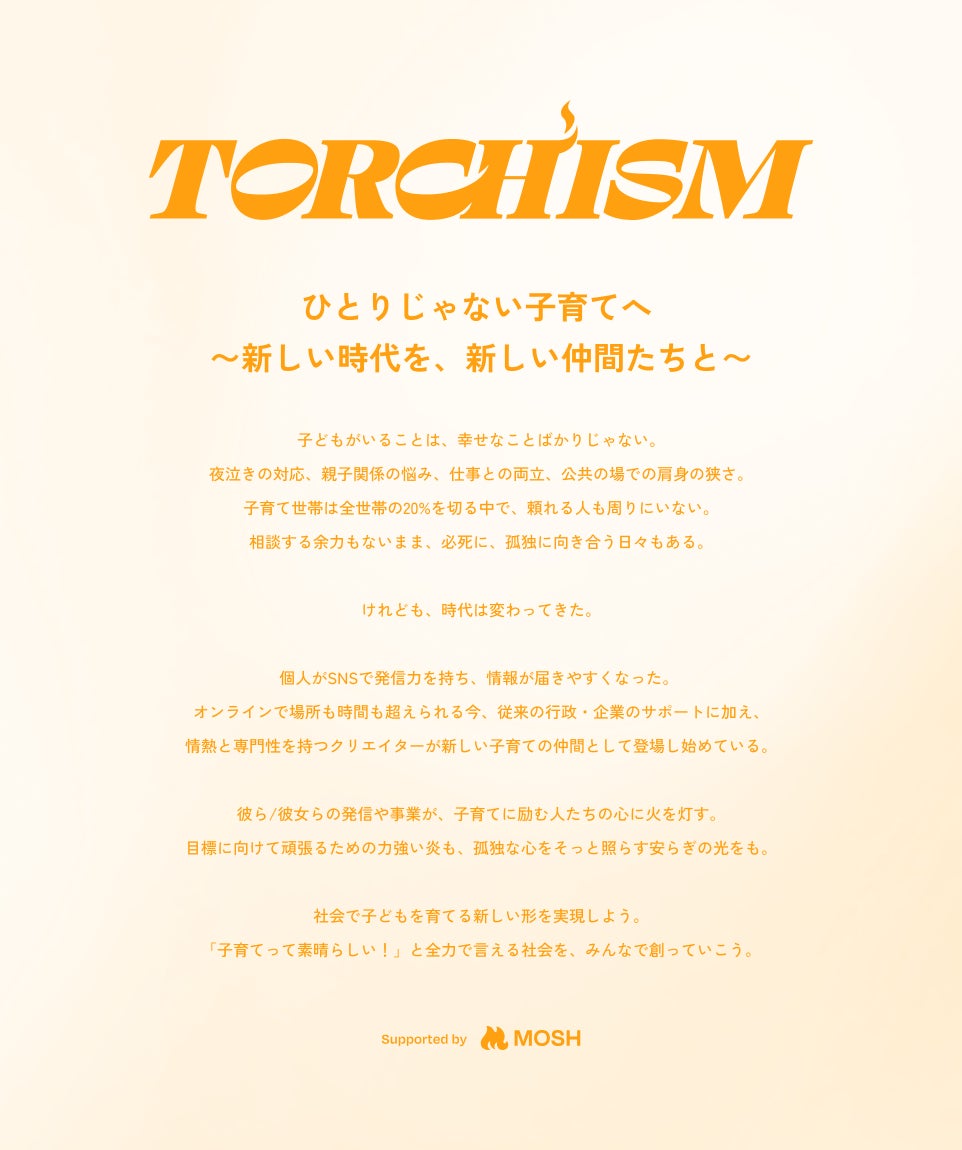 MOSH株式会社(本社:東京都渋谷区、代表取締役社長:籔和弥)は、子育て領域のトップクリエイターを特集し、SNSを通じた新しい育児の連帯を提唱する企画を展開いたします。