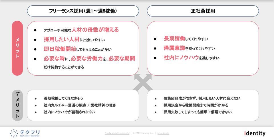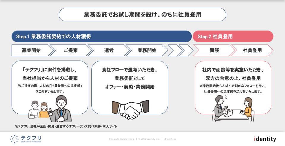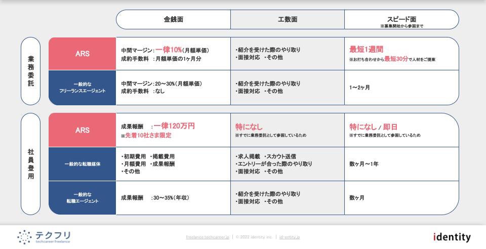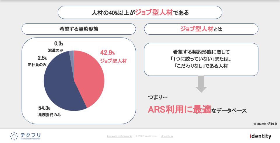 株式会社アイデンティティー(東京都新宿区、以下「当社」)は、正社員採用の新しいカタチである「ARS」(Advanced Recruiting Service)を提供開始しました。IT人材不足が叫ばれている昨今、IT人材の正社員採用は困難を極めています。そこで、「母集団形成ができない」「ミスマッチが多い」など採用担当者さまの声を参考に、正社員採用と業務委託契約を組み合わせるという新たな採用手法を構築いたしました。詳細な内容(実際の採用担当者さまの声や、サービス概要など)については、以下のURLからダウンロードいただけます。