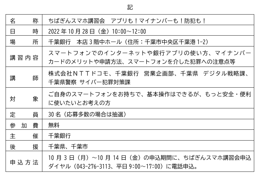 千葉銀行(頭取 米本 努)は、2022年10月28日(金)、千葉県と千葉市の後援のもと「ちばぎんスマホ講習会 アプリも!マイナンバーも!防犯も!」を開催します。
