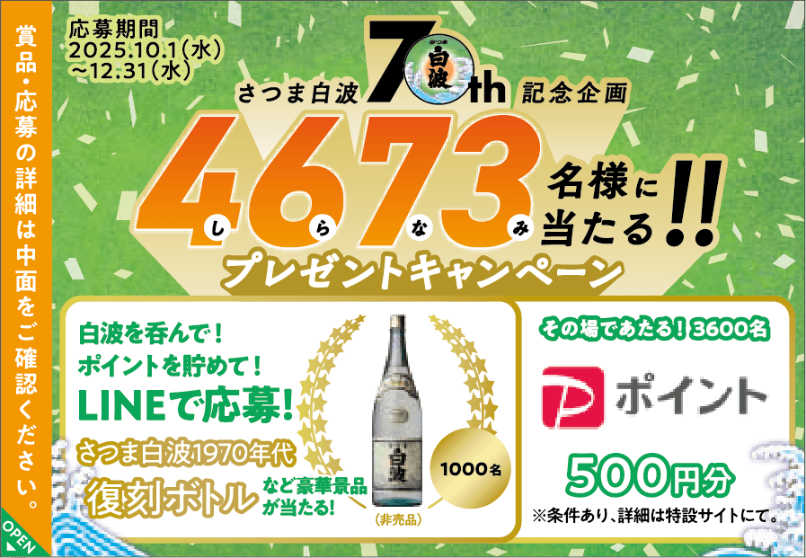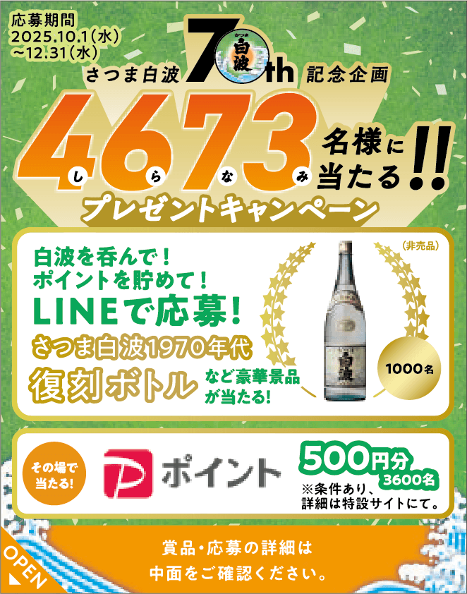 以来、九州のみならず日本全国のお客様に長くご愛飲いただいており今日に至ります。 この70周年を記念し、皆様の日頃のご愛顧に感謝して、「さつま白波70周年記念企画 4673(しらなみ)名様に当たる!プレゼントキャンペーン」を開催いたします