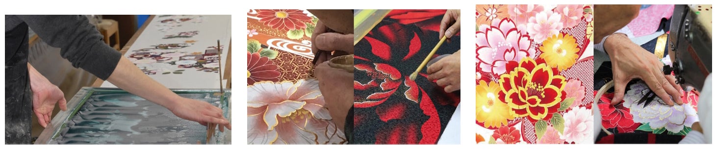 振袖製造は着物の伝統技術や、匠の技が豊富に詰まったモノづくりの世界です。しかしながら、匠の技を受け継ぐ数少ない職人たちも高齢化しており、その伝統技法を継承し引き継がれること自体が難しくなってきています。日本の着物文化や、伝統技術を残し継承していくためにもグループ会社の京都豊匠では、職人の技や思いに触れ、技術を受け継ぎ匠の技を結集した振袖づくりをおこなっています。