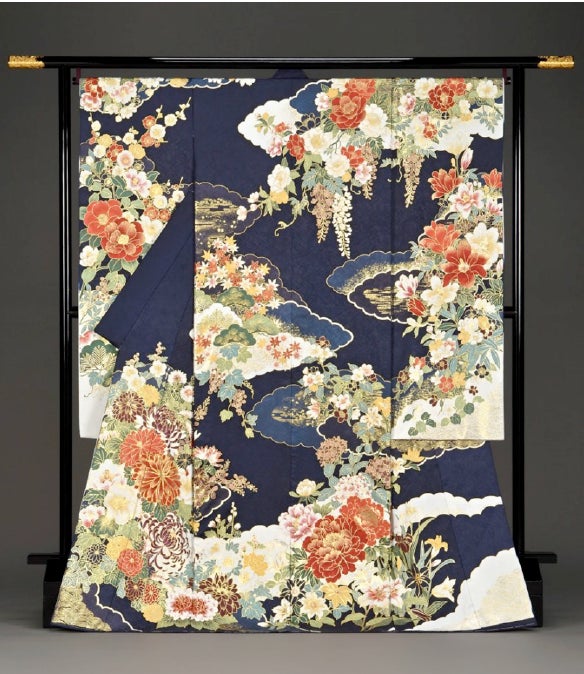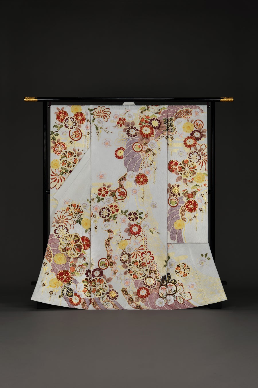 日本の良さである季節の移り変わりの美しさを1枚の振袖で表現しました。春、夏、秋、冬と季節の草花をデザインし、雲取りにすることで場面をハッキリと区切らず少しずつ季節が巡るよう、柄が繋がるように絶妙なバランスで配置し、細かく繊細な金彩加工で仕上げた作品です。