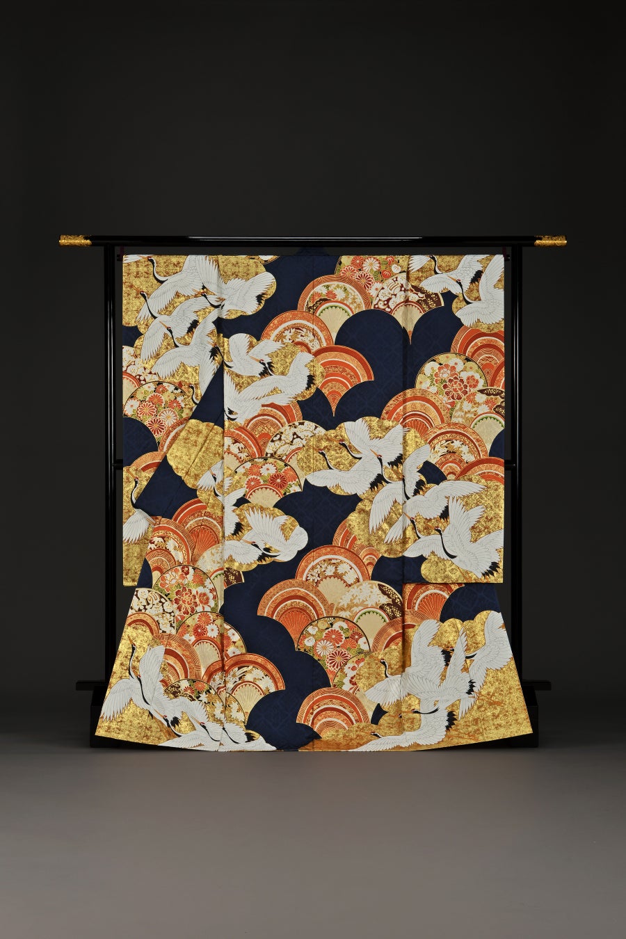 【鶴は千年、亀は万年】という言葉のように長寿の象徴としておめでたい席に用いられる鶴をメインにデザインしました。沢山の鶴が空を舞う姿は個性的で癖のあるデザインですが紺地に金彩が栄え豪華でクールな人目を引く作品です。青海波は扇のように変形をさせ吉祥文様で彩ります。