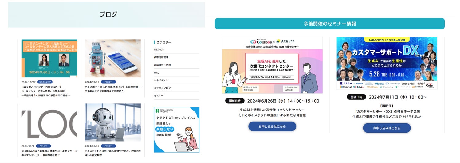 訪問者が必要な情報を直感的に見つけやすくするために、ブログ記事、セミナー情報、導入事例など、重要なコンテンツを視覚的にわかりやすく整理しました。また、従来課題となっていた「サービスが多くわかりにくい」という点を改善するため、トップページにサービスカテゴリ(「PBX/CTI」「CRM」「データ活用・分析」「回答支援・自己解決」)が一目でわかるレイアウトを追加し、訪問者が理解しやすいように工夫しました。