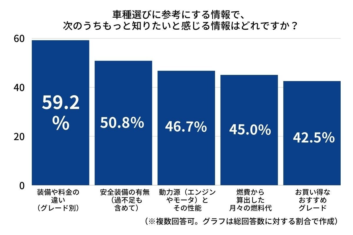 「装備や料金の違い(グレード別)」が1位で、59.2%の人が詳しく教えてほしいと答えています。2位は「安全装備の有無(過不足も含めて)」(50.8%)、3位は「動力源(エンジンやモータ)とその性能」(46.7%)、4位「燃費から算出した月々の燃料代」(45.0%)、5位「お買い得なおすすめグレード」(42.5%)と続きました。