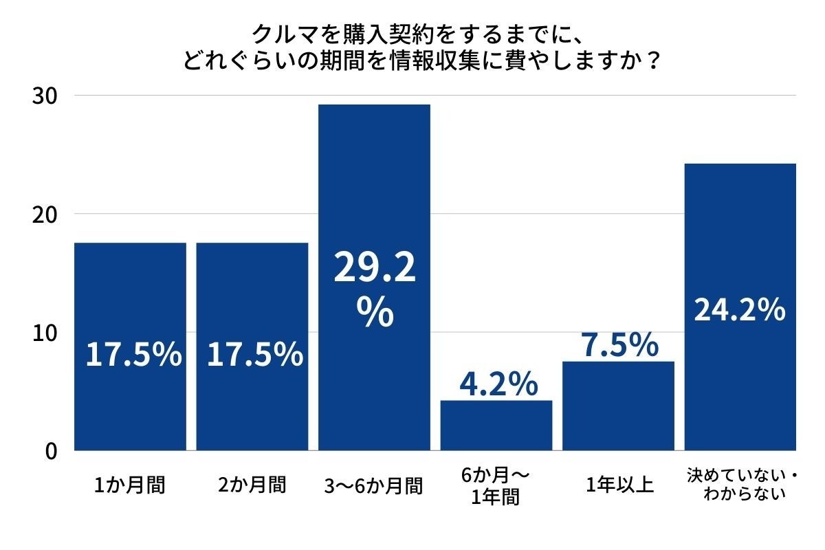 クルマ好きで常日頃から新車情報を収集している人以外は、やはりクルマを買い換える理由が発生して初めて情報収集する人が少なくないと思います。そこで、1つ目の質問は「情報収集に費やす期間」について聞きました。