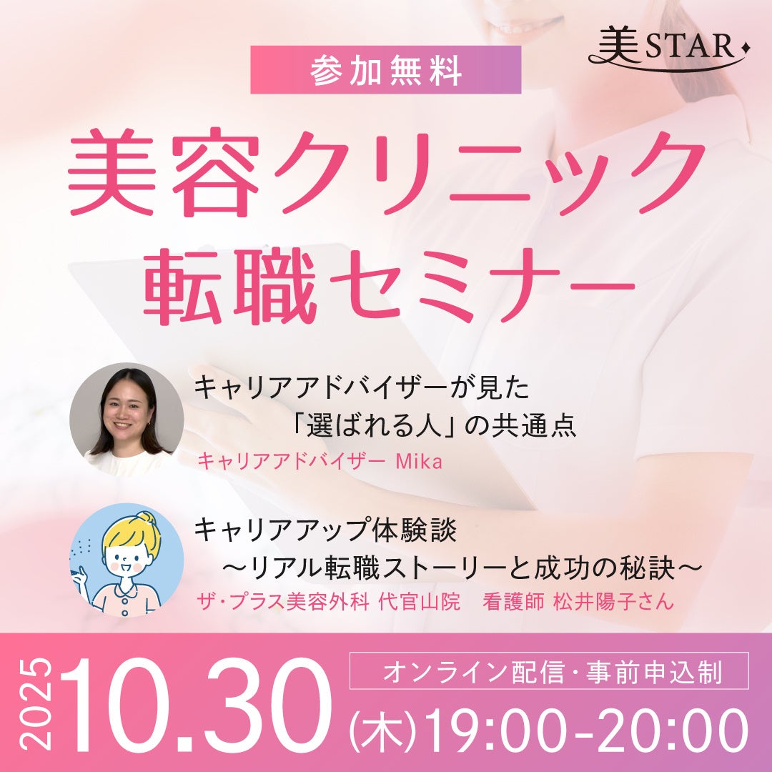 【10月30日(木)開催】美STAR 「第2回 美容クリニック転職セミナー」美STAR出身看護師の「リアルな声」と「キャリアアップの秘訣」を徹底公開!