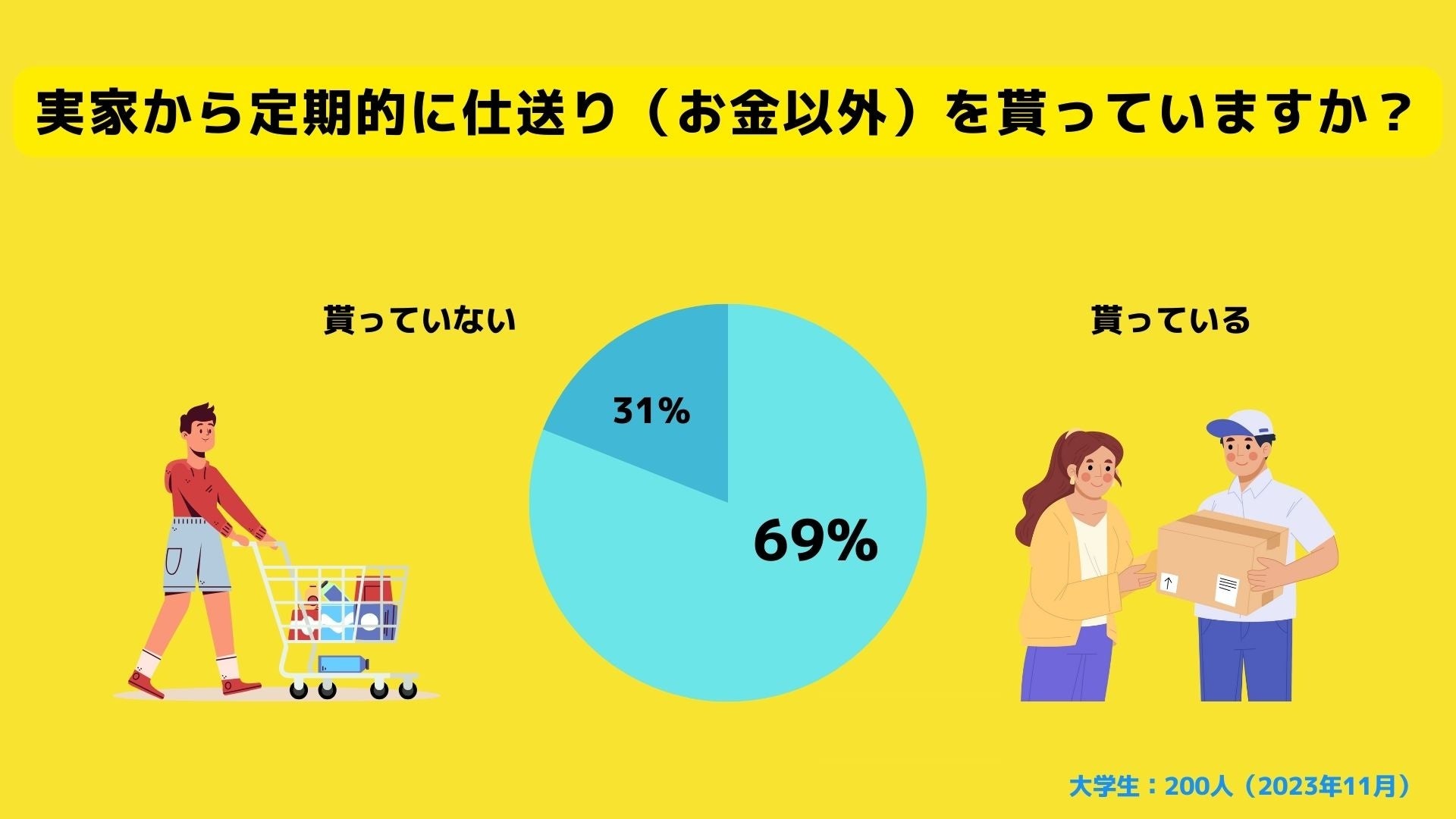 ■現在一人暮らしをしている大学生の69%が定期的に仕送り(お金以外)を貰っていると回答。