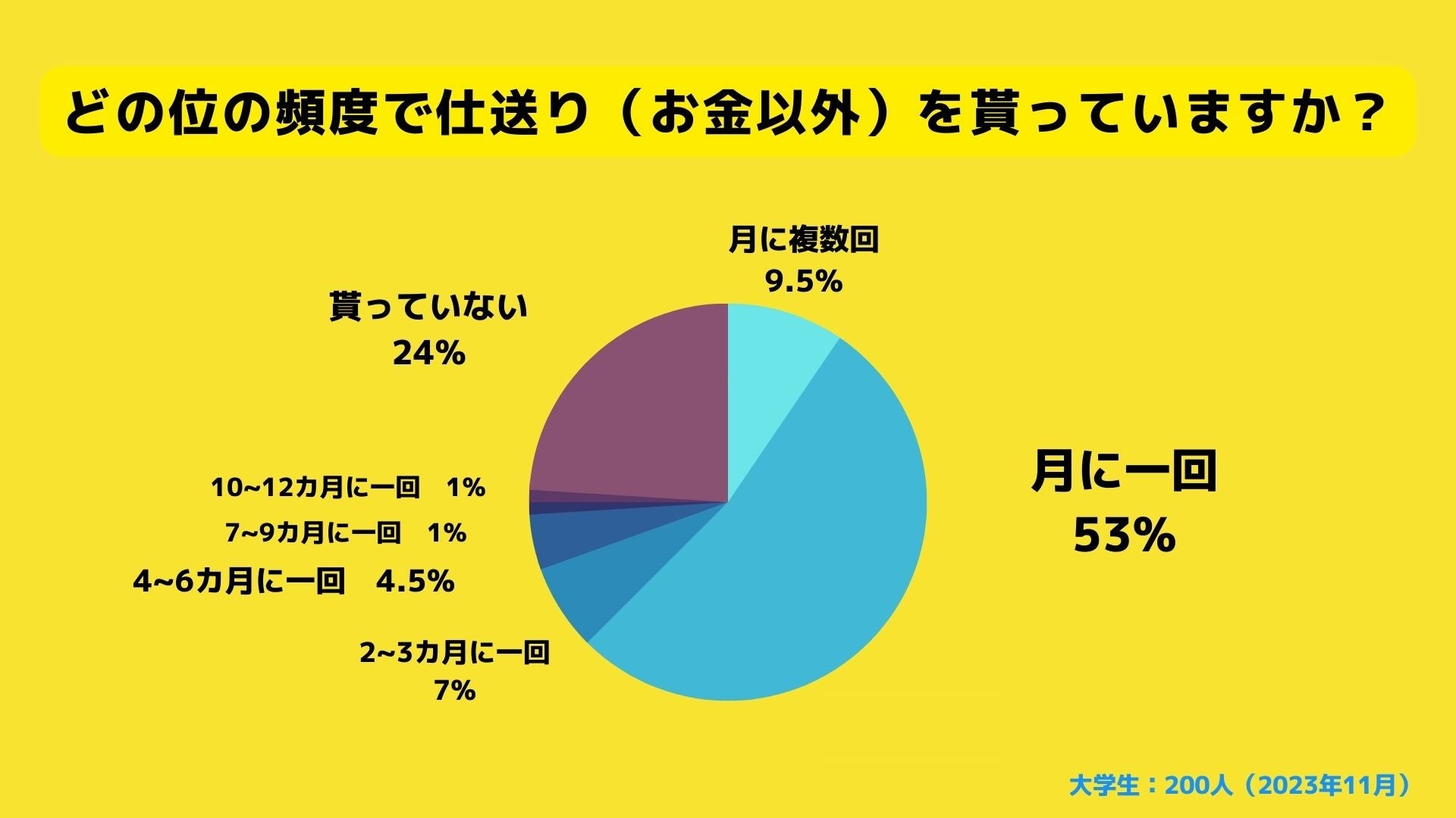 今回の調査では、仕送りを貰う頻度や具体的に貰っているものについて調査しました。