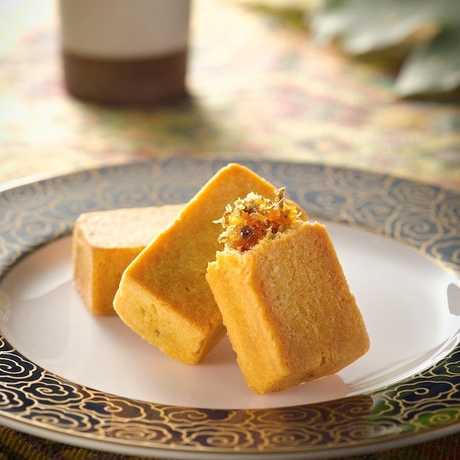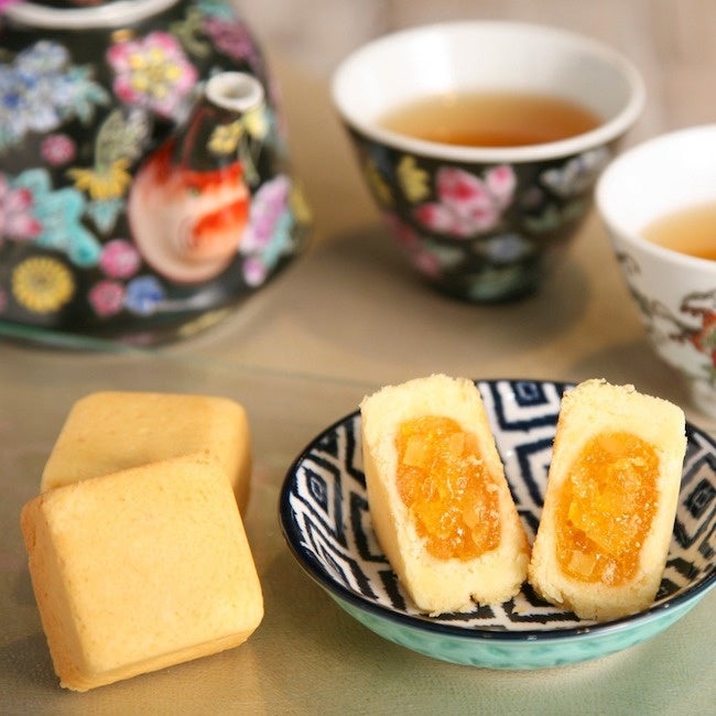 一口サイズがうれしい、オリジナルとウーロン茶の2種類のパイナップルケーキ。餡はパイナップルの繊維を感じる甘酸っぱく爽やかな味わいです。セットになった台湾茶とのペアリングを楽しんで。