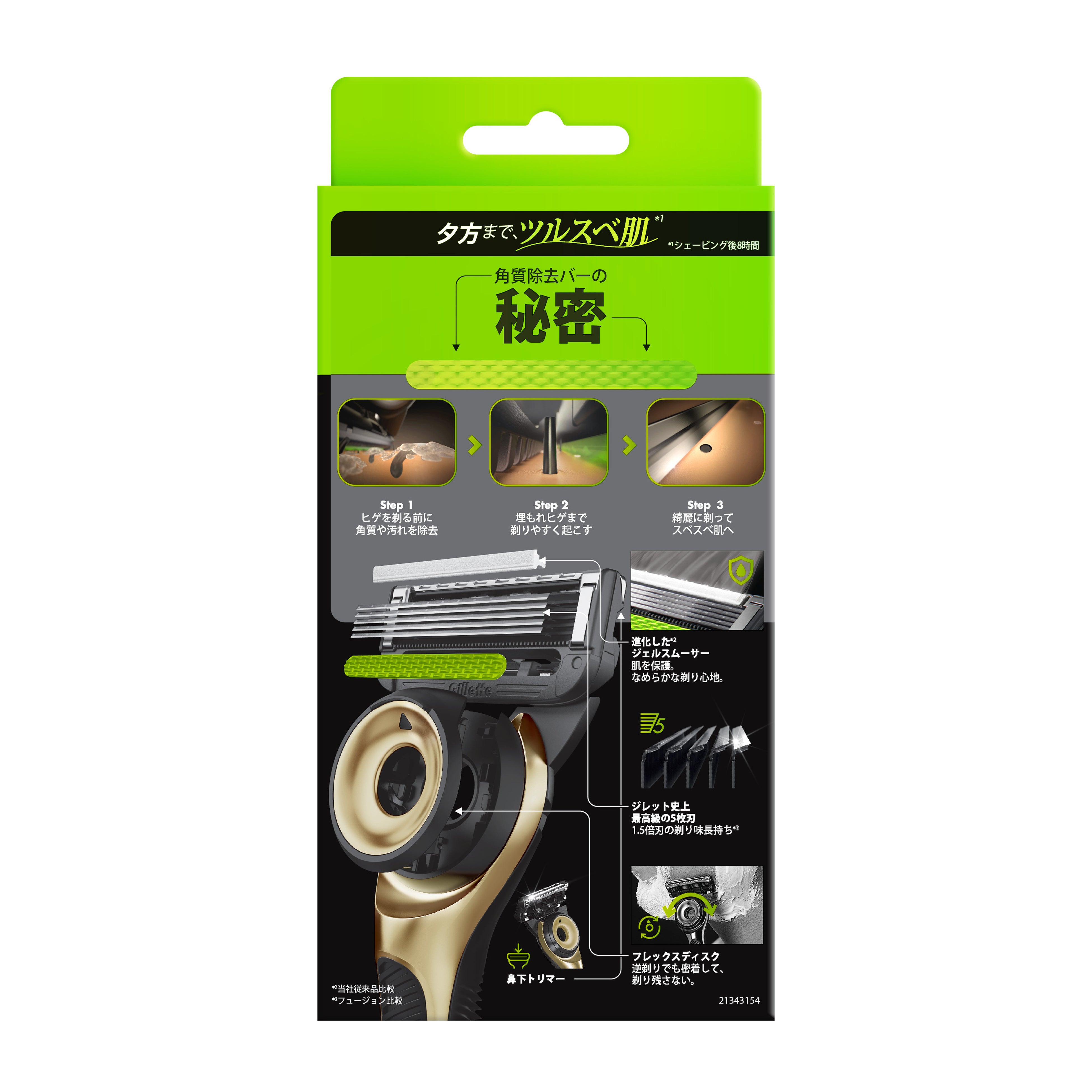 より快適なシェービングを実現するために、「ジレット」史上最⾼級の5枚刃へのアップグレードに加えて、新たな刃を加えました。これまで1種類のみであった刃が、新たに2種類の組み合わせとなり、肌へのひっかかりを軽減*8します。また、進化した替刃は1.5倍刃の切れ味が⻑持ち*9するようになりました。