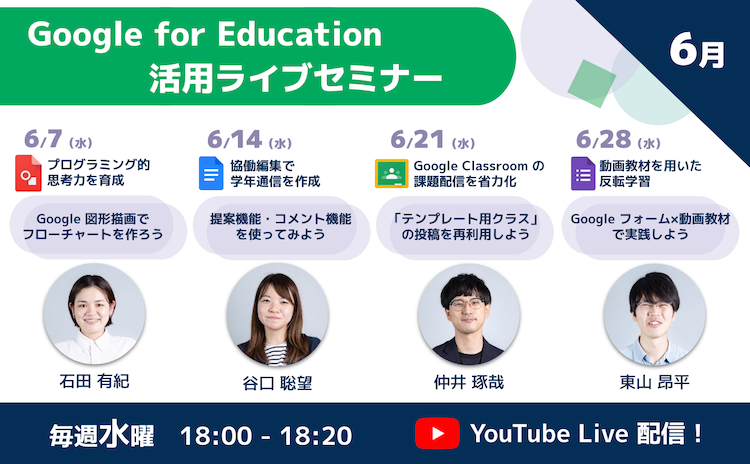 ● 6月7日(水)【ICT授業研究】 プログラミング的思考力を育成 <Google 図形描画でフローチャートを作ろう> ● 6月14日(水)【校務DX】 協働編集で学年通信を作成 <提案機能・コメント機能を使ってみよう> ● 6月21日(水)【校務DX】 Google Classroom の課題配信を省力化 <「テンプレート用クラス」の投稿を再利用しよう> ● 6月28日(水)【ICT授業研究】 動画教材を用いた反転学習 <Google フォーム×動画教材で実践しよう> ※ すべて18:00〜18:20開催 |