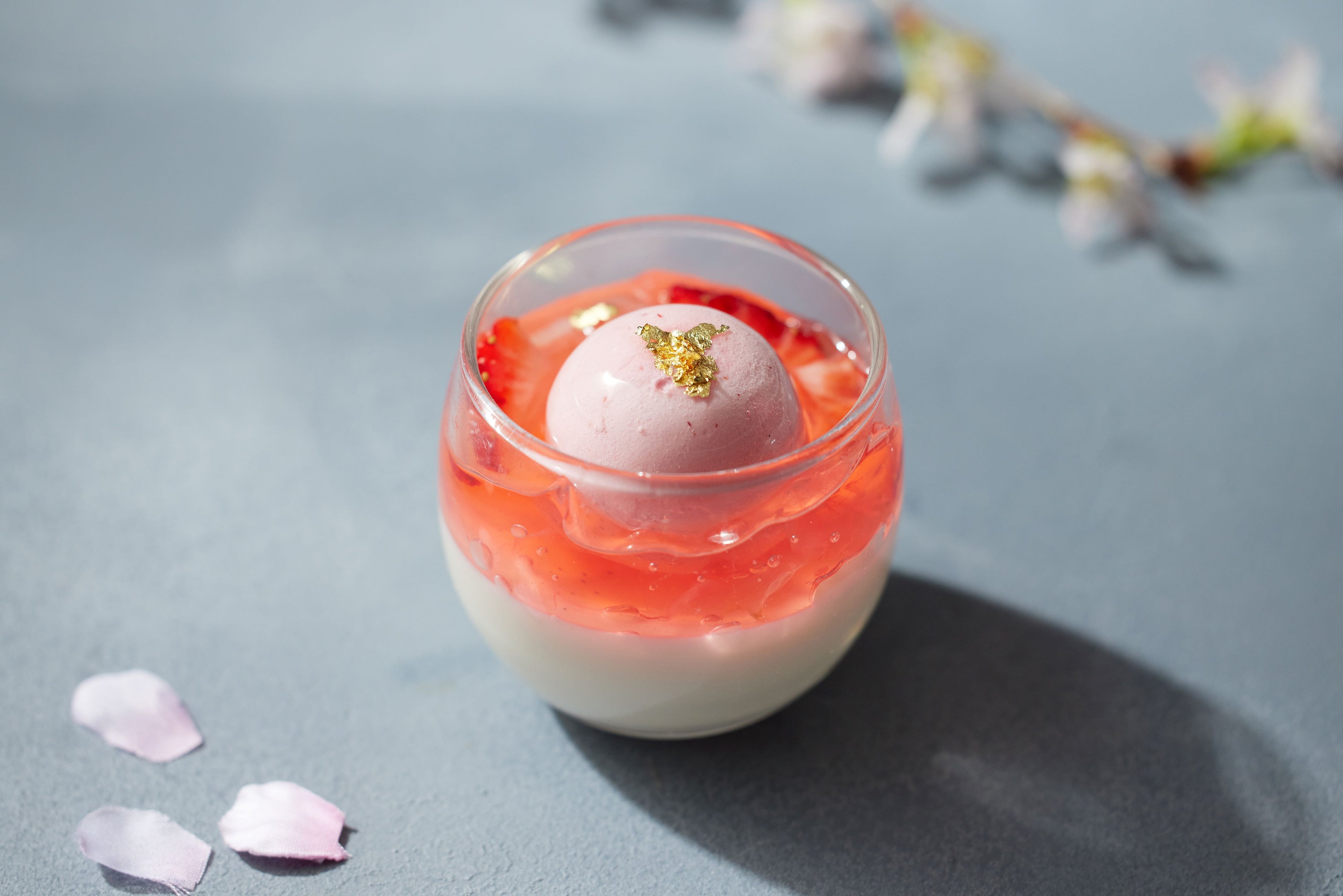 繊細なピンク色が目を惹く桜のパンナコッタに、苺の果肉を楽しめる桜とエルダーフラワーのジュレを乗せました。春らしい見た目でアフタヌーンティーを彩ります。
