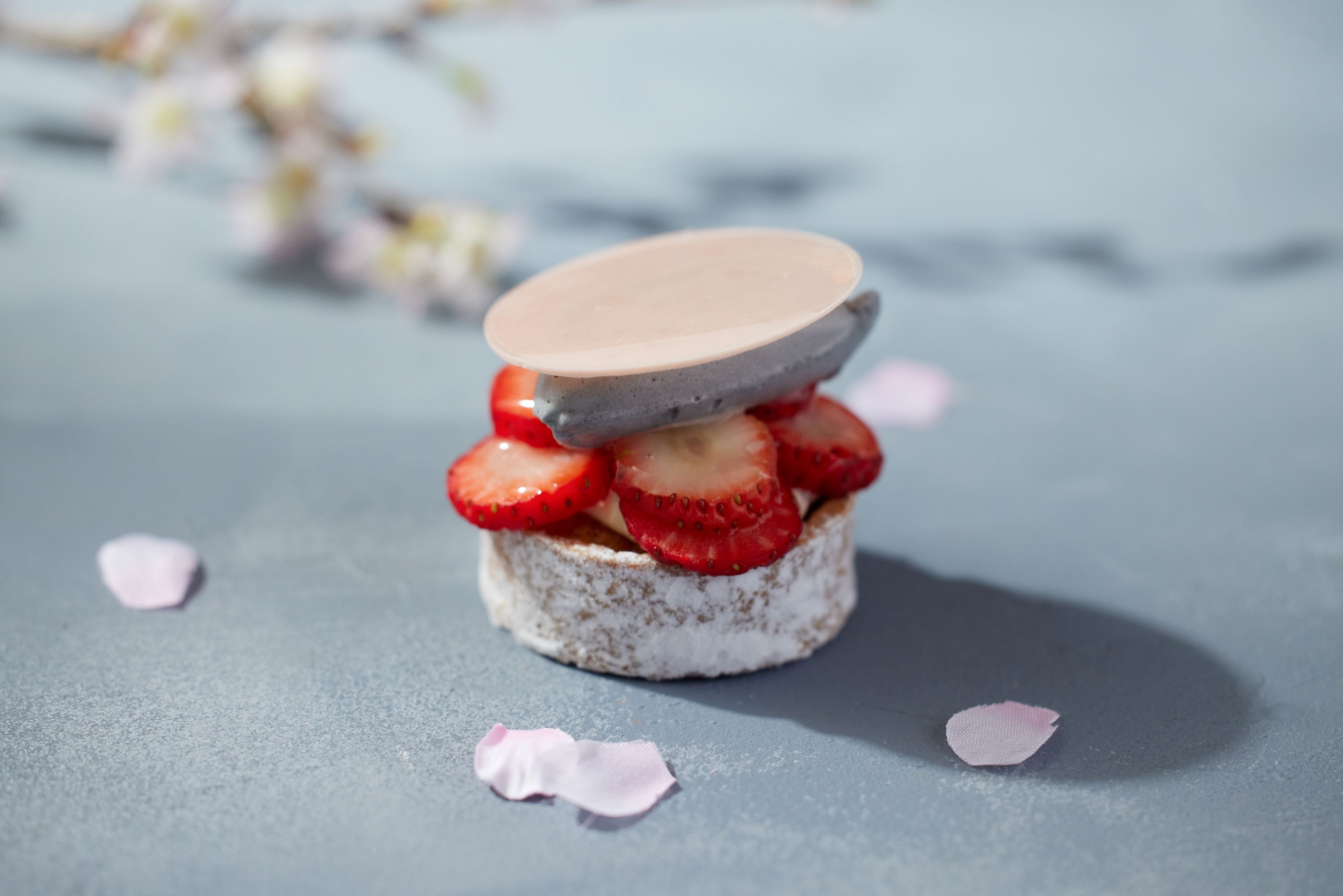 苺とラズベリーを使用した甘酸っぱいソースの周りを苺と桜のムース、グレーのチョコレートでコーティングし、これまで見たことのないグレーの苺を作りました。パリッとしたチョコレートの中から、ソースが溢れ出てくる演出もお楽しみいただけます。