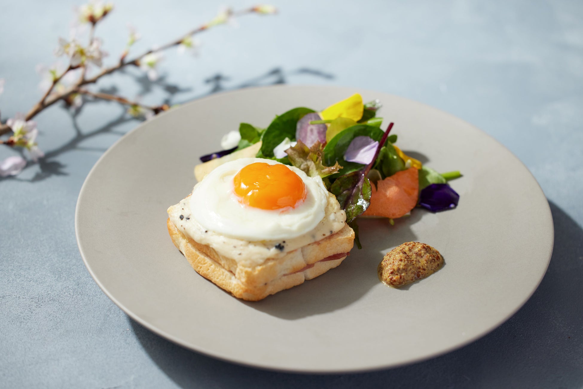 桜の塩漬けと白トリュフオイル、刻んだトリュフの濃厚なベシャメルソースが贅沢なクロックマダムです。しっとりとした優しい食感のミルクパンの上に、特製ベシャメルソース、ハムとチーズ、目玉焼きを乗せ焼き上げました。サイドには、すっきりとした味わいが特徴の桜のはちみつを使ったハニーマスタードドレッシングのサラダを添えています。