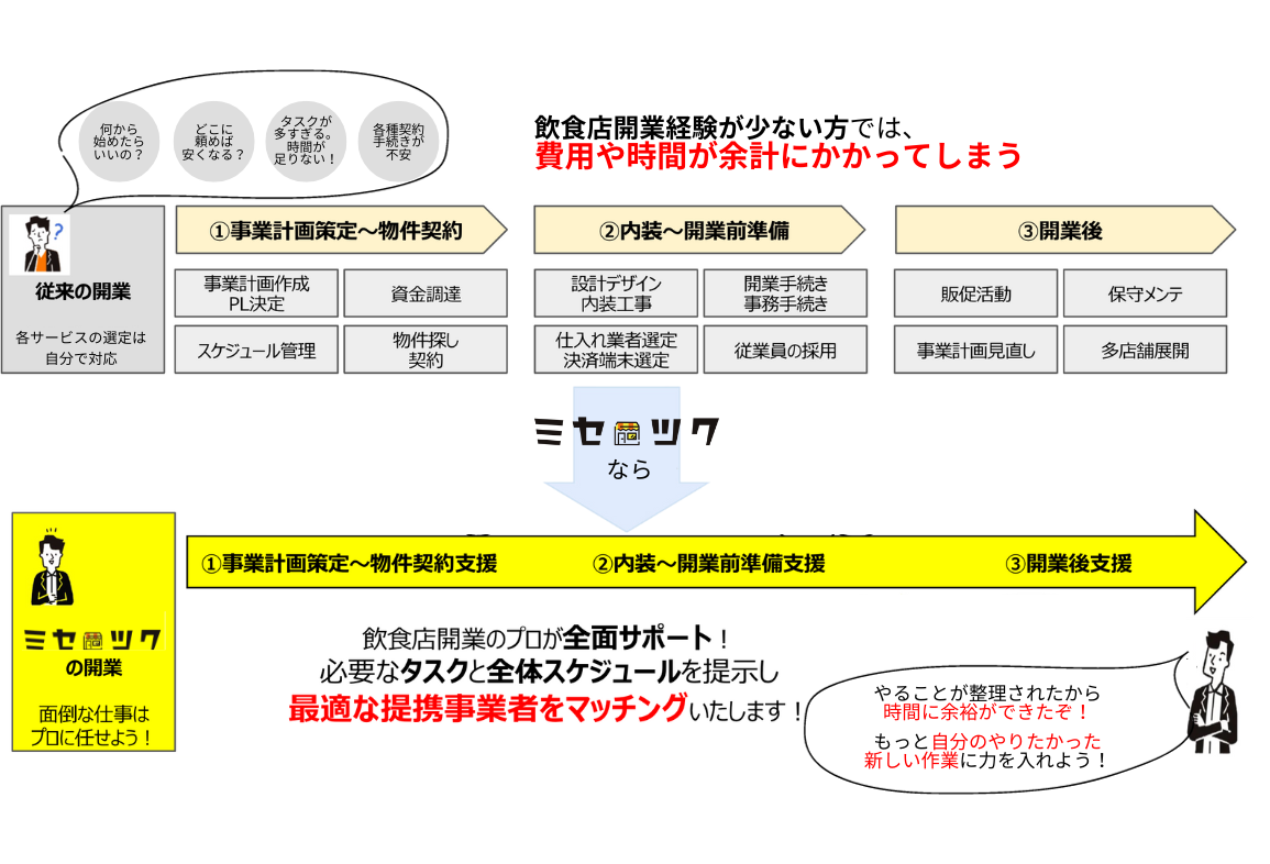 「ミセツク」は過去多くの飲食店の出店計画から内装工事、店舗運営に携わった経験から、他社にはない独自のスキームを保有しております。少しでも多くの方の”開業”という夢の実現を、事業計画査定から開業後の売上拡大まで一貫して応援させていただきたいという想いから「ミセツク」は生まれました。