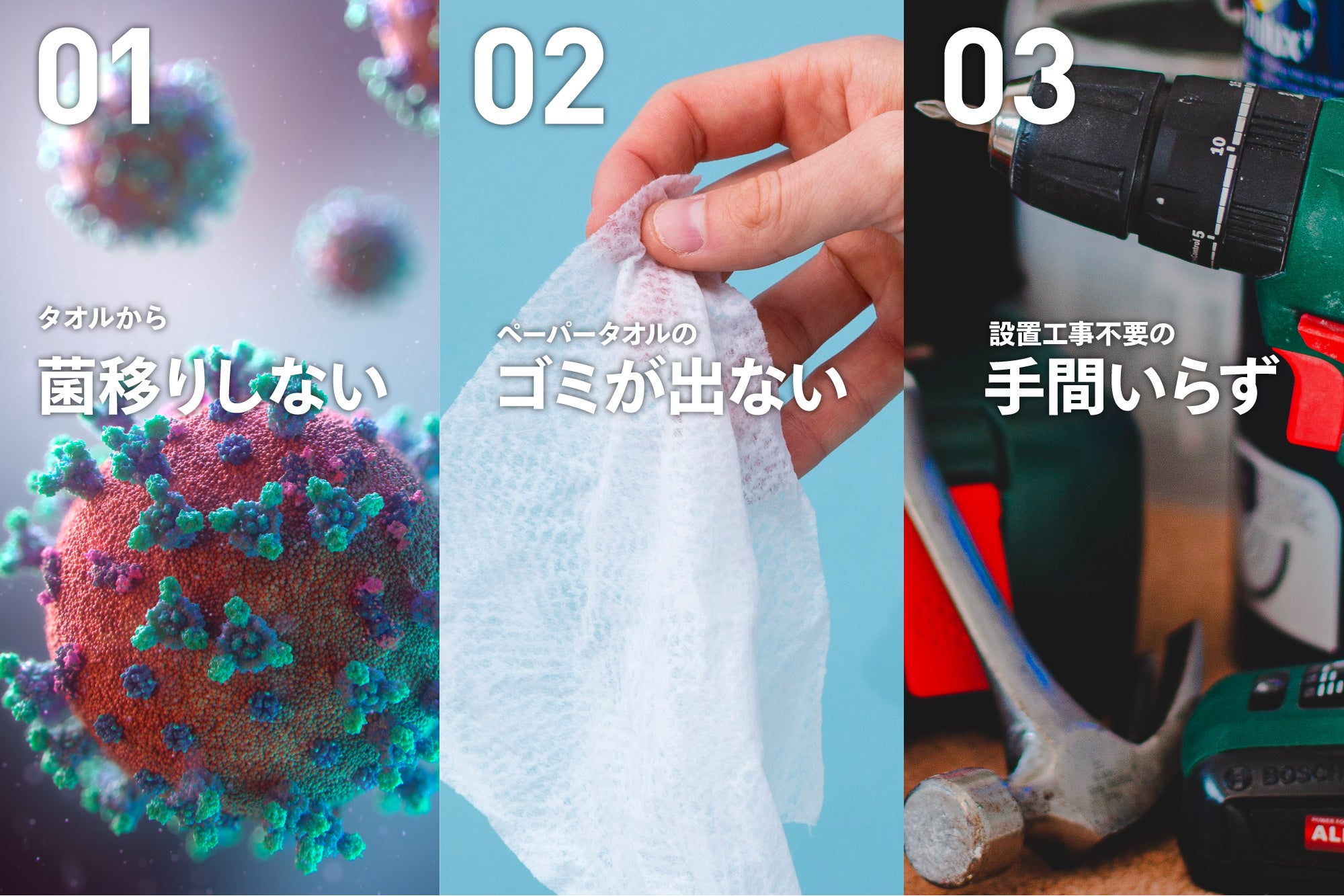 省スペース、工事・メンテナンス費用不要の置くだけ設置なので、コンセントがあればどこでも設置可能です。業務用に比べ低コストで導入可能なため、減価償却が比較的しやすいのも特徴です。業務用に比べ設置面積も小さいため、省スペースで導入が可能。工事も専門的なメンテナンスも不要で、コンセントに繋げて台などに置くだけで簡単に設置ができます。たとえば、お客様が使い終わったペーパータオルがゴミ箱から溢れ、トイレに散らばっていてお困りの経験がある方におすすめの商品です。