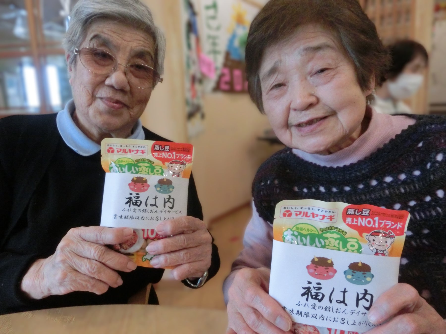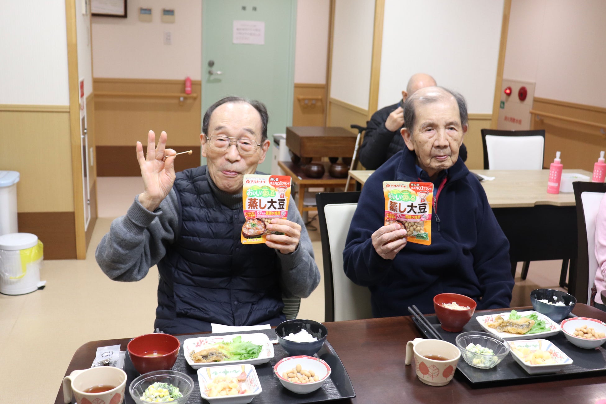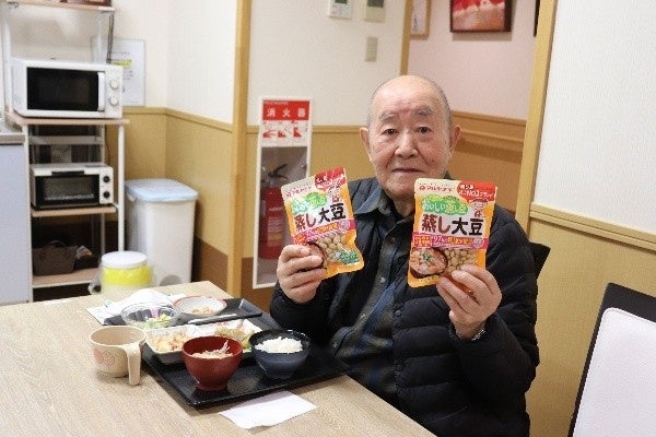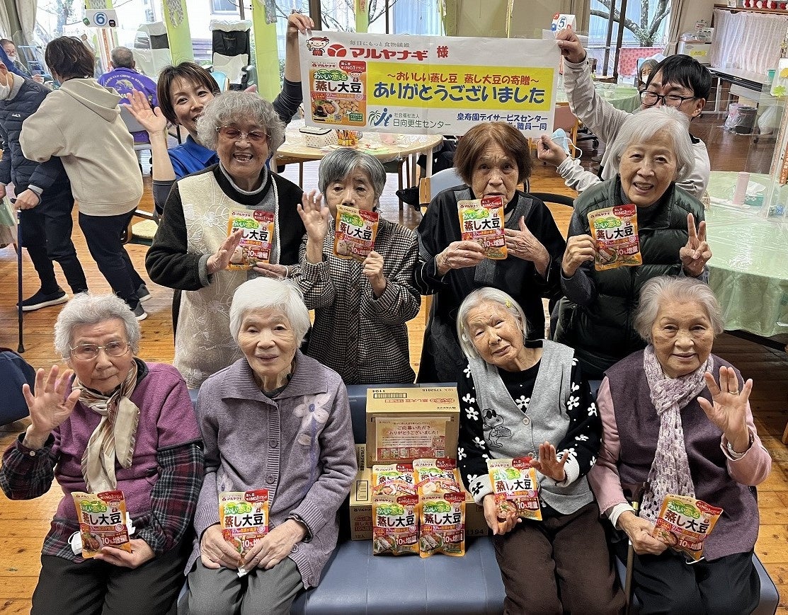 蒸しているから大豆のおいしさと栄養そのままに手軽に召し上がっていただける「蒸し大豆」は、たんぱく質や食物繊維の摂取源として、筋力低下や便秘などの健康課題を抱えるご高齢の方々にもぜひ召し上がっていただきたい食品です。「節分の煎り大豆は硬くて食べづらい」と感じるご高齢の方にも、やわらかく蒸した「蒸し大豆」で、邪気を祓い無病息災を願う「節分」の風習を楽しんでいただけるよう、マルヤナギは「おいしい蒸し豆 蒸し大豆」を高齢者向け施設にお届けしました。