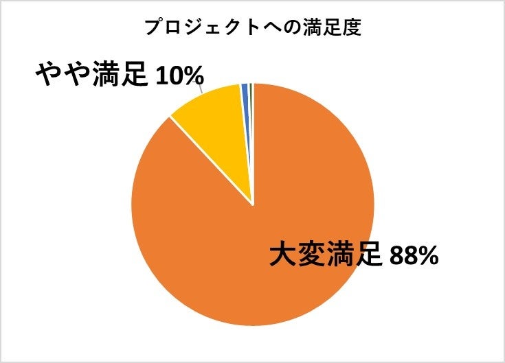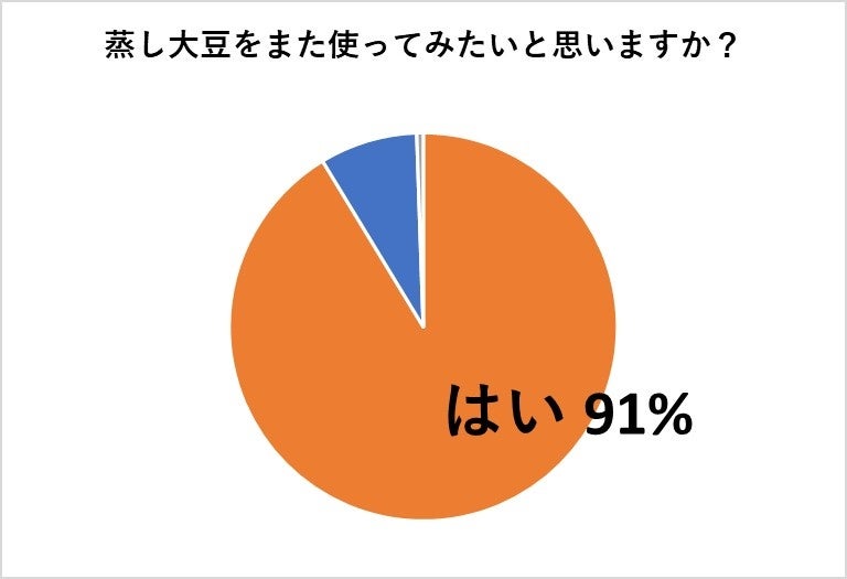 プロジェクト実施後に行った事後アンケートでは、「蒸し大豆をまた使ってみたいと思いますか?」の質問に対して91%が「はい」と回答。また、プロジェクトの満足度に関しては、88%が「大変満足」、10%が「やや満足」と98%が満足であるとの回答をいただきました。施設の利用者様、従業員の方からの嬉しいお声も沢山いただきました。