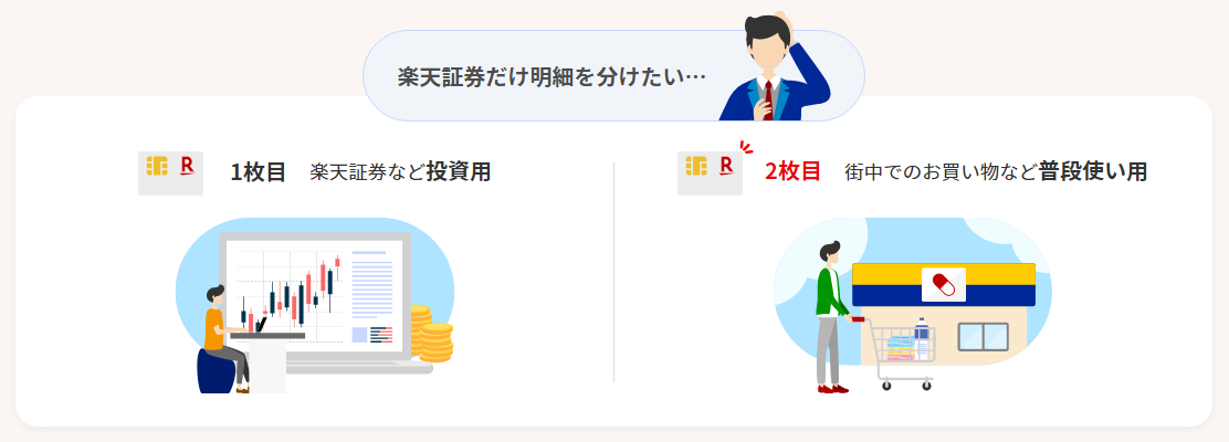 楽天証券の投信積立用に1枚目を利用。ネットや街でのお買い物など普段使い用に2枚目を追加。「殖やすお金」と「使うお金」を分けて管理。
