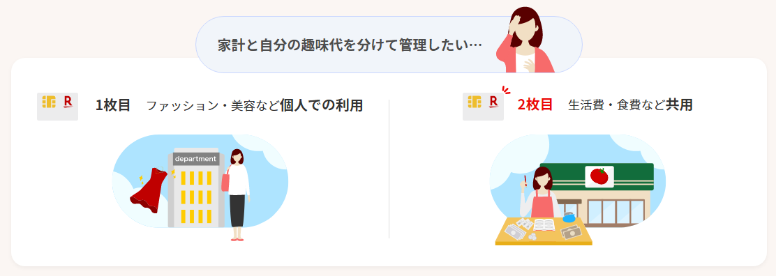 個人で「楽天カード」を利用していた方が、生活費や食費など家族共用の支払いに2枚目を追加。引き落とし口座を別にすることで、プライベートと家計の費用を分けて管理。