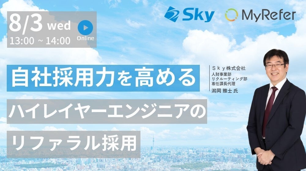 株式会社MyRefer(本社:東京都新宿区、代表取締役社長CEO:鈴木貴史)は、リファラル採用のハイレイヤー比率約63%、内定承諾率100%を実現し、転職潜在層から12名の優秀なエンジニアを採用しているSky株式会社をゲストにお招きして、「ハイレイヤーエンジニアを獲得するリファラル採用」をテーマにお話いただくオンラインセミナーを8月3日(水)に開催いたします。